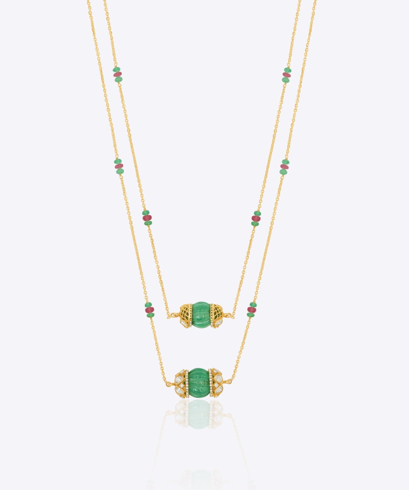 Our necklace collection, with elegant silhouettes and curated gemstones, exudes charm. Rich gold layers embody subtle sophistication, perfect for the discerning wearer.