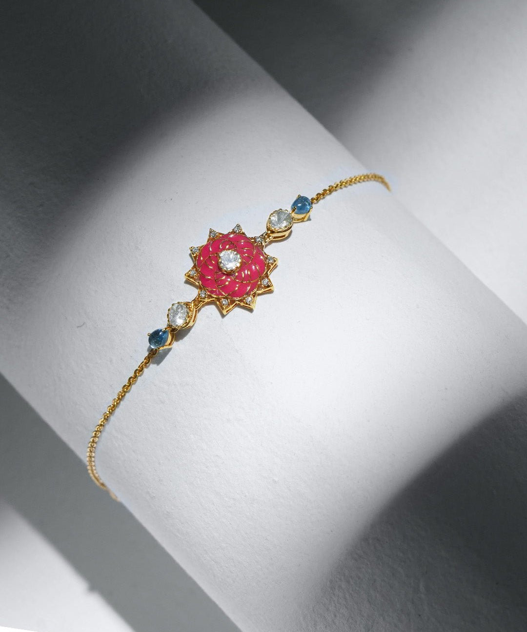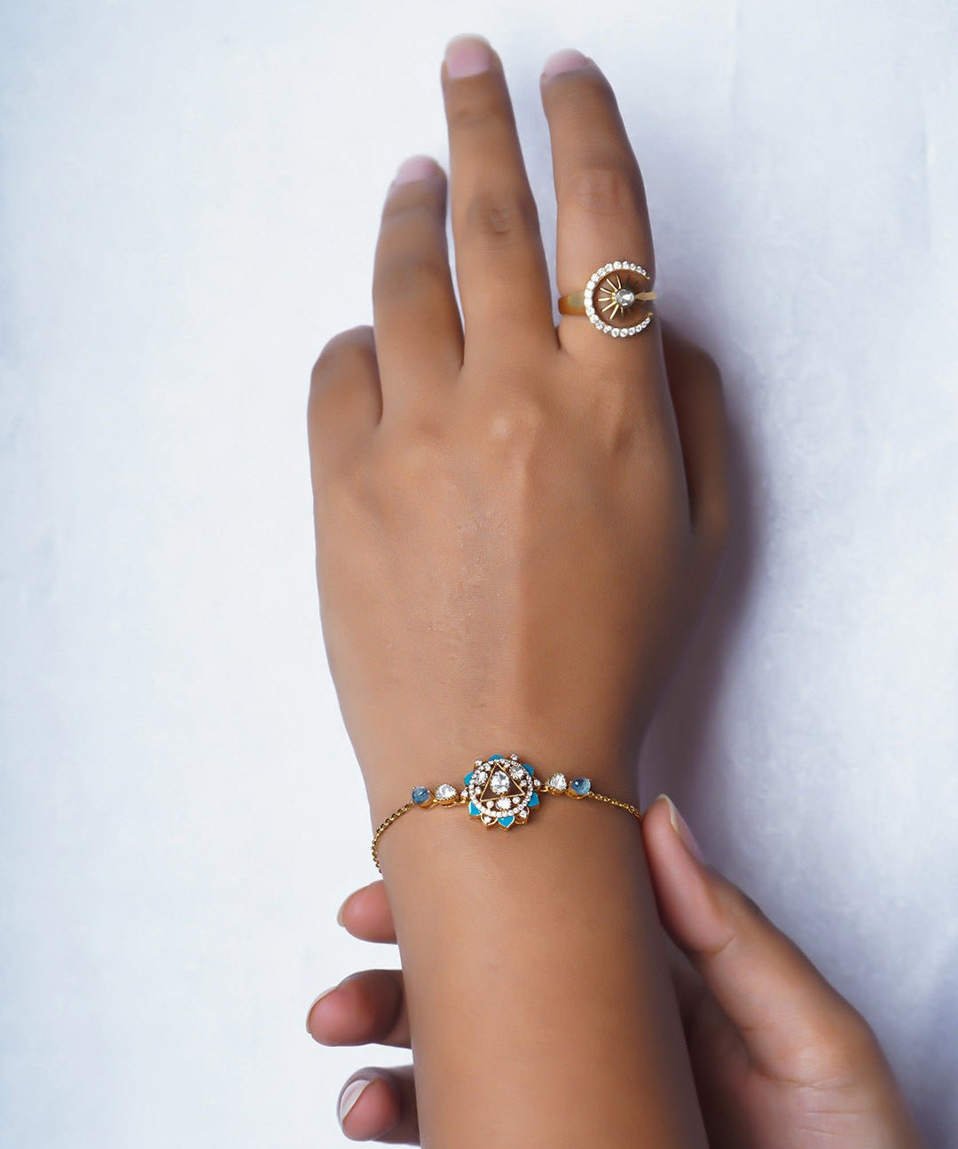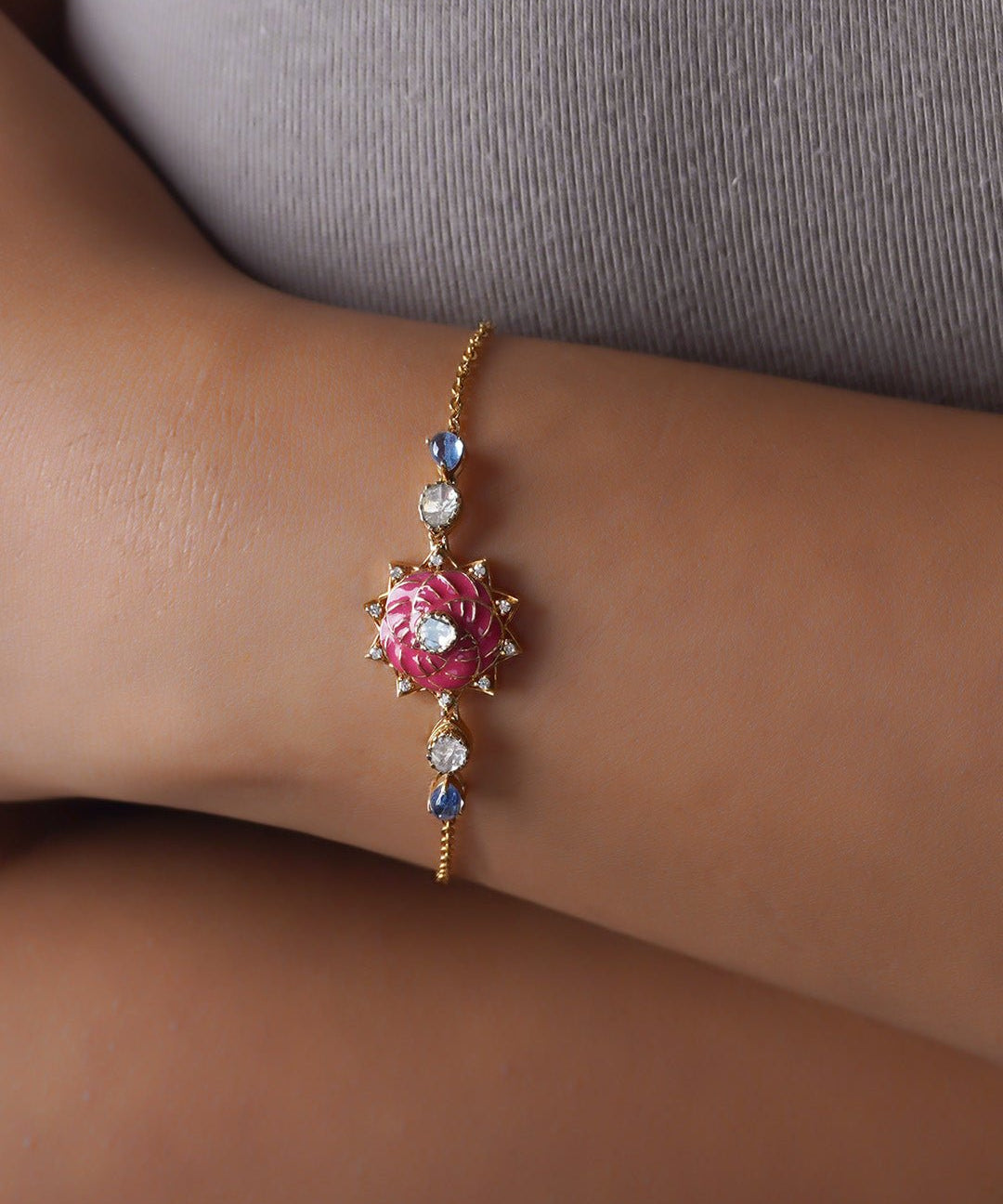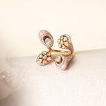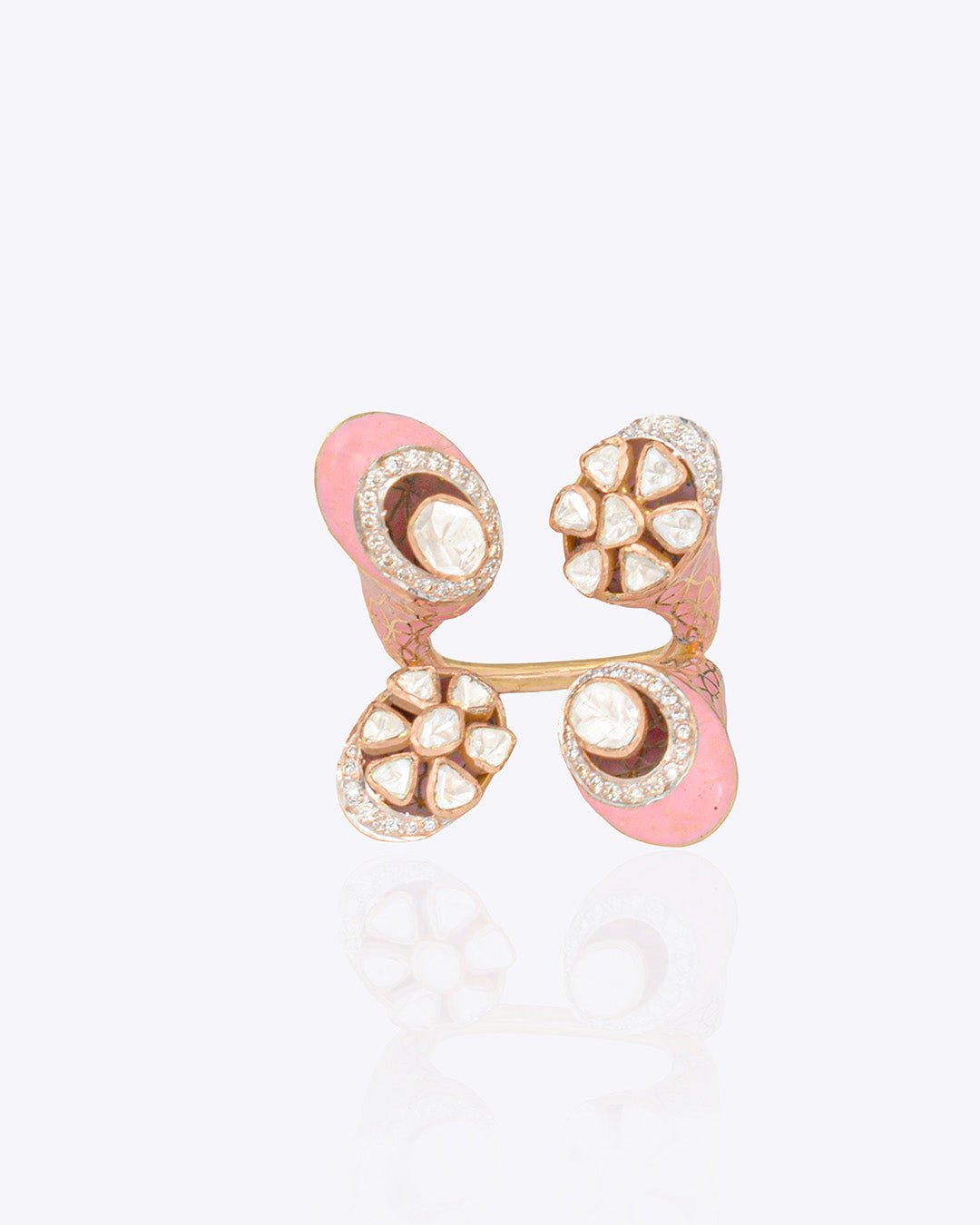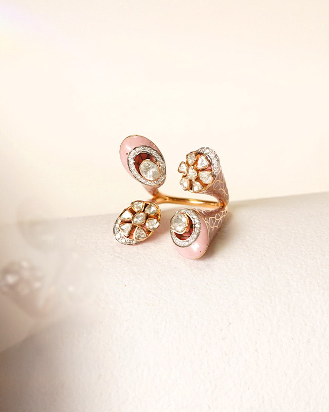 A poetic blend of tradition and modernity, this 18k gold ring features Polki and brilliant-cut diamonds in a sculptural floral silhouette. Blush enamel detailing adds a dreamy, dawn-like glow — a delicate statement of elegance and romance.