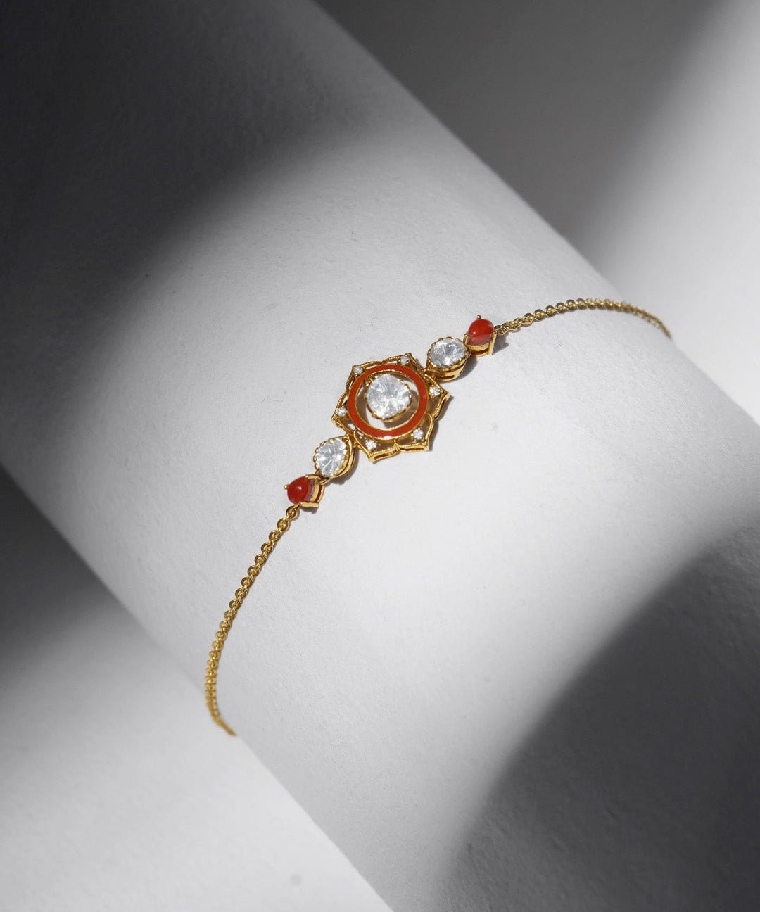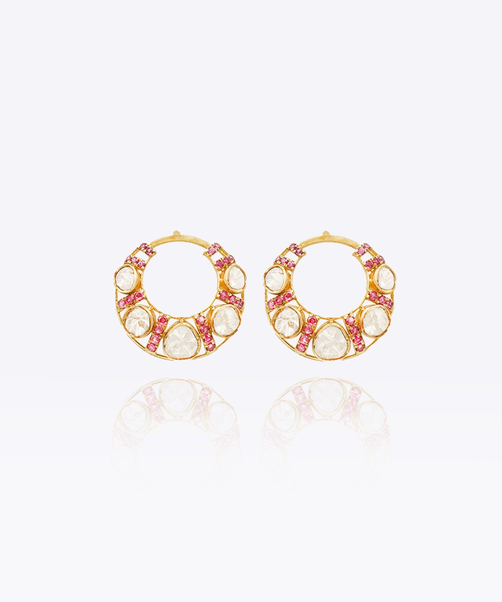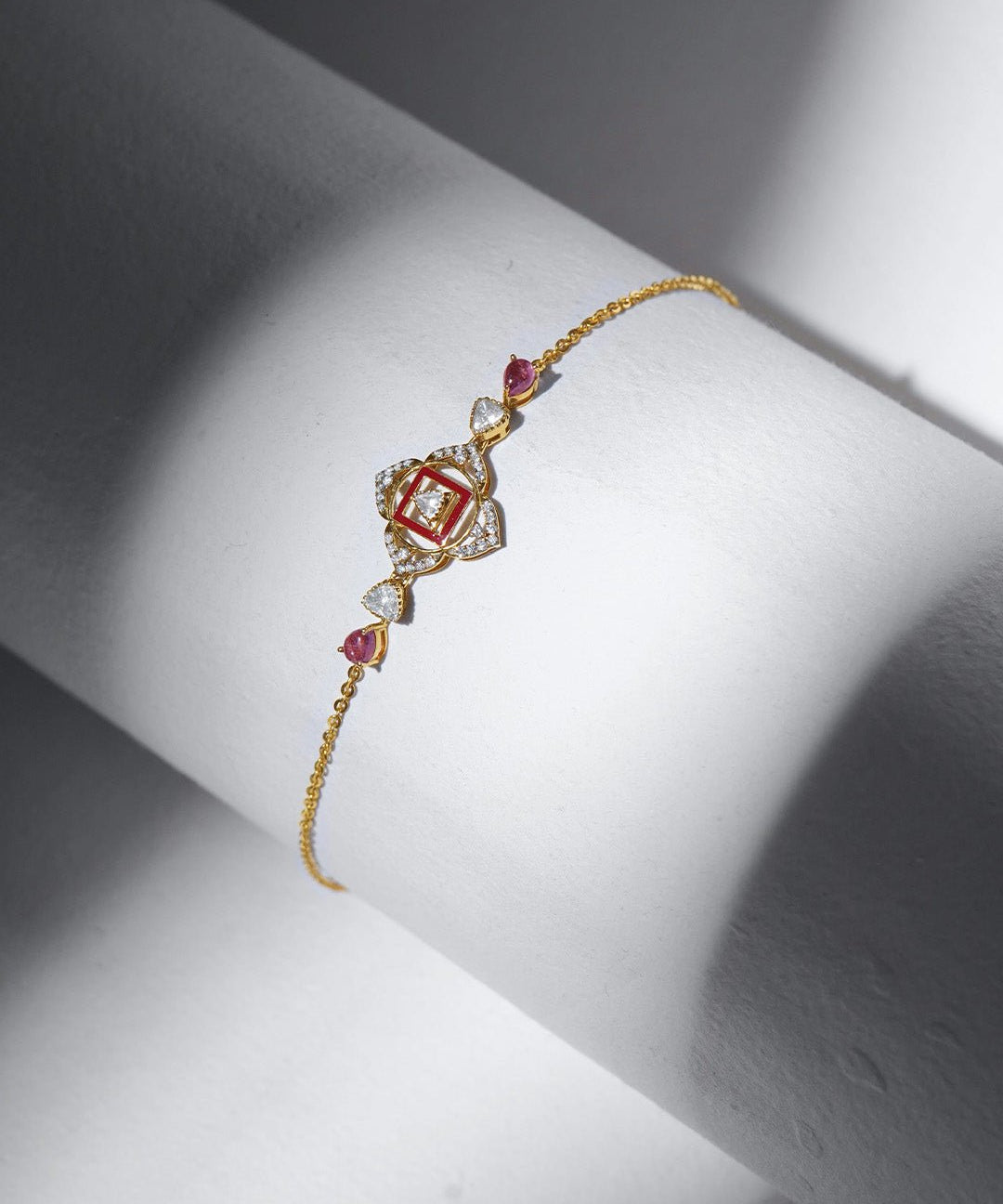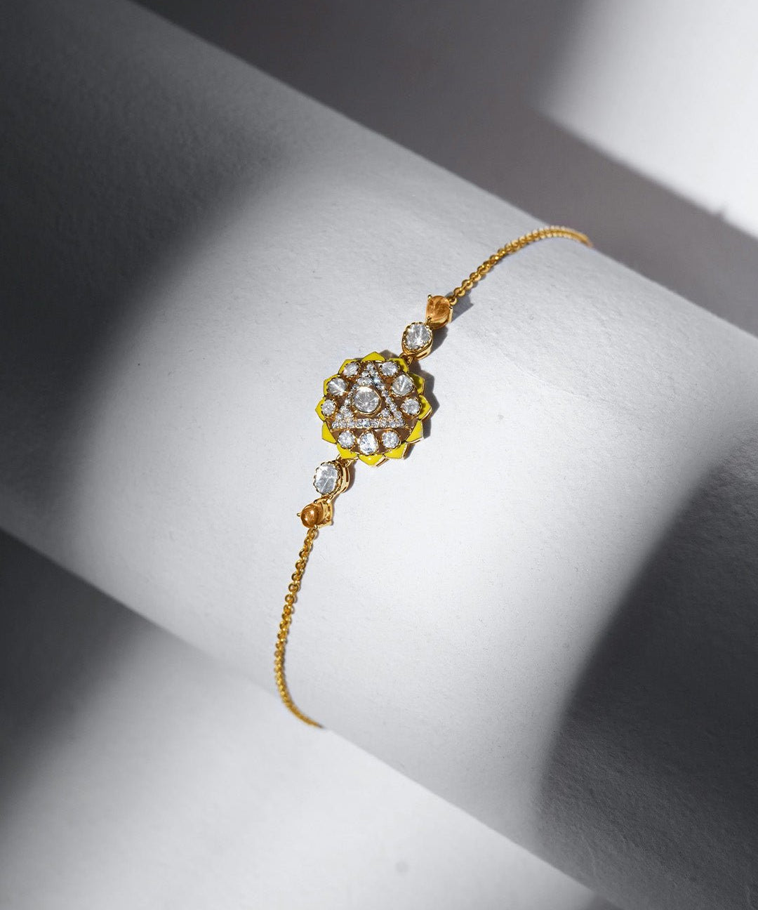 A poetic blend of tradition and modernity, this 18k gold ring features Polki and brilliant-cut diamonds in a sculptural floral silhouette. Blush enamel detailing adds a dreamy, dawn-like glow — a delicate statement of elegance and romance.