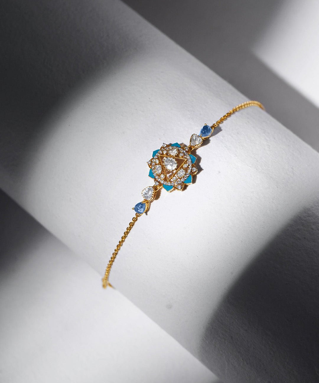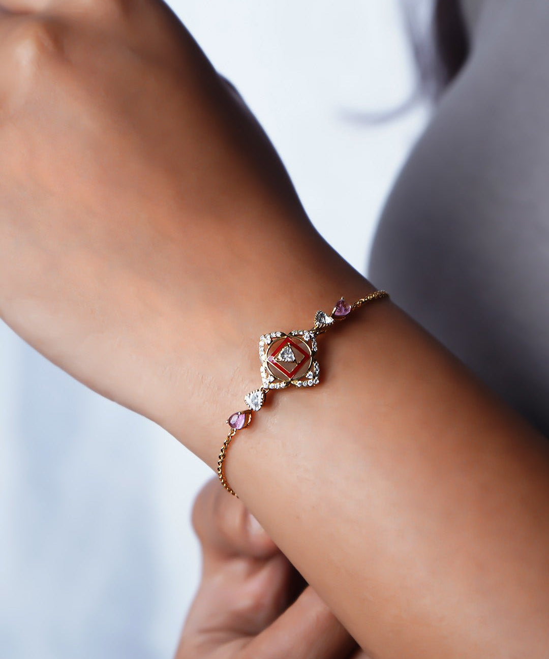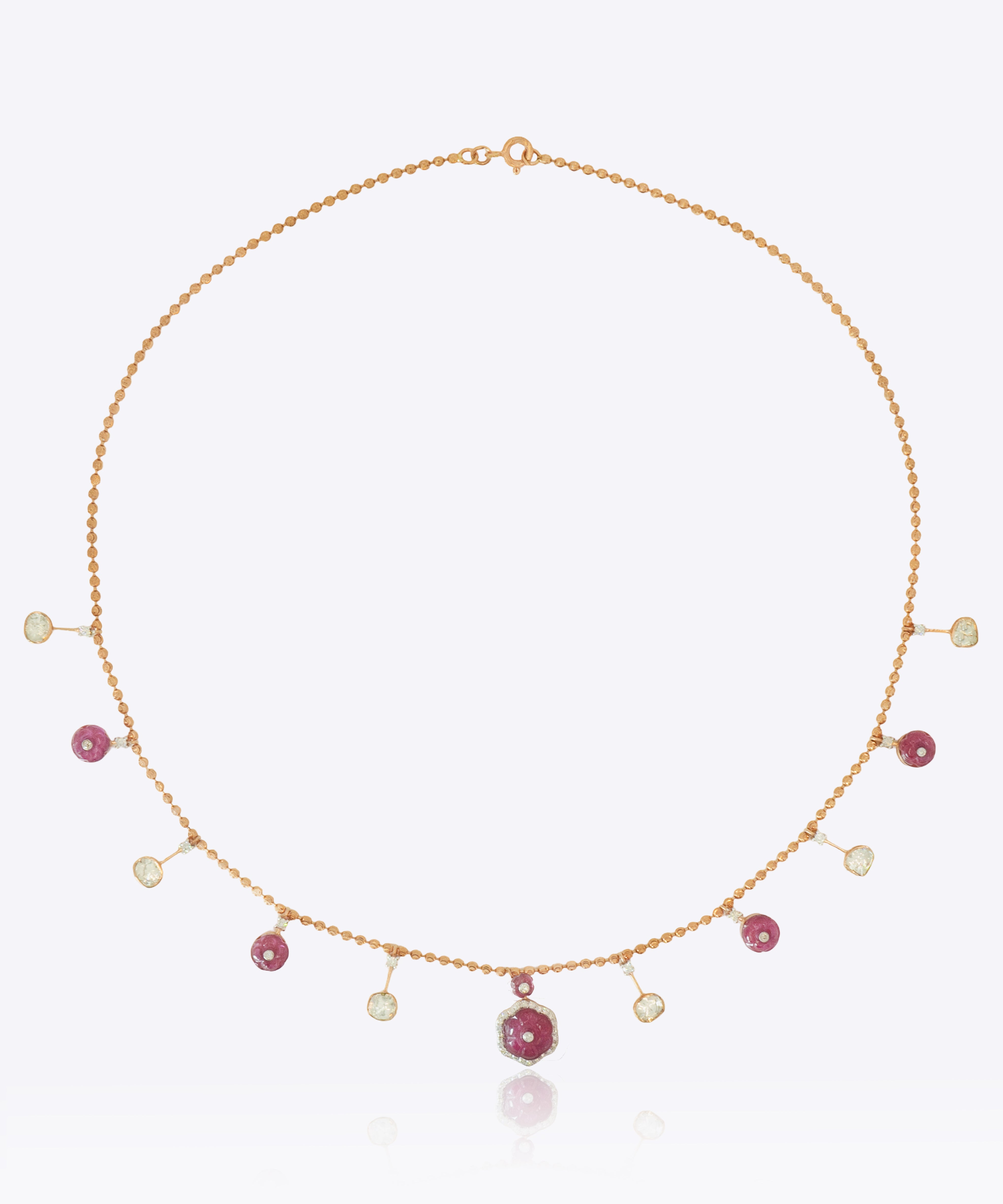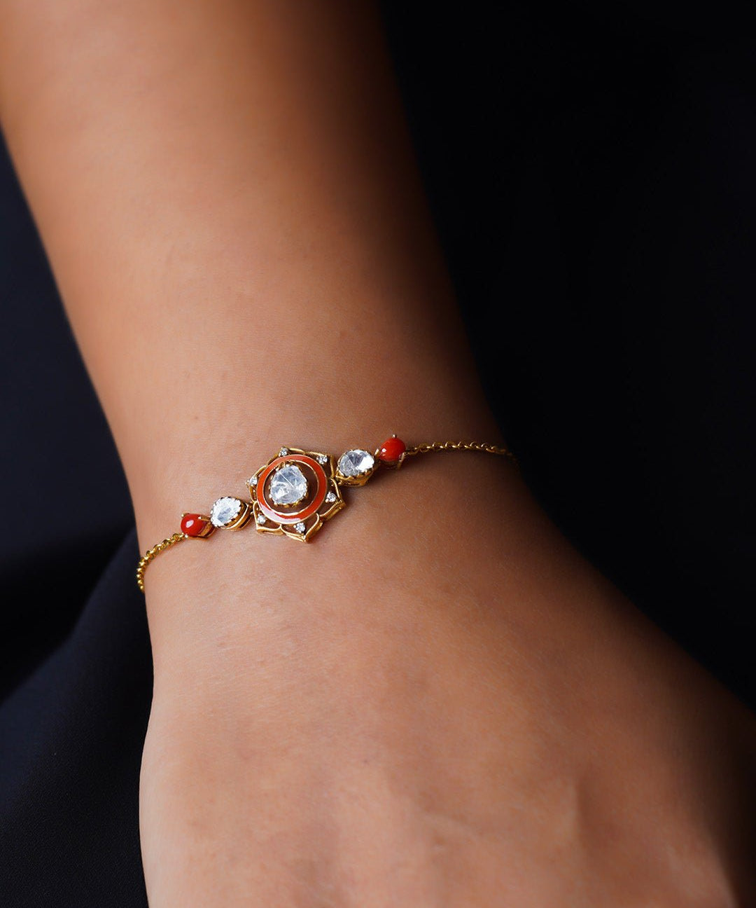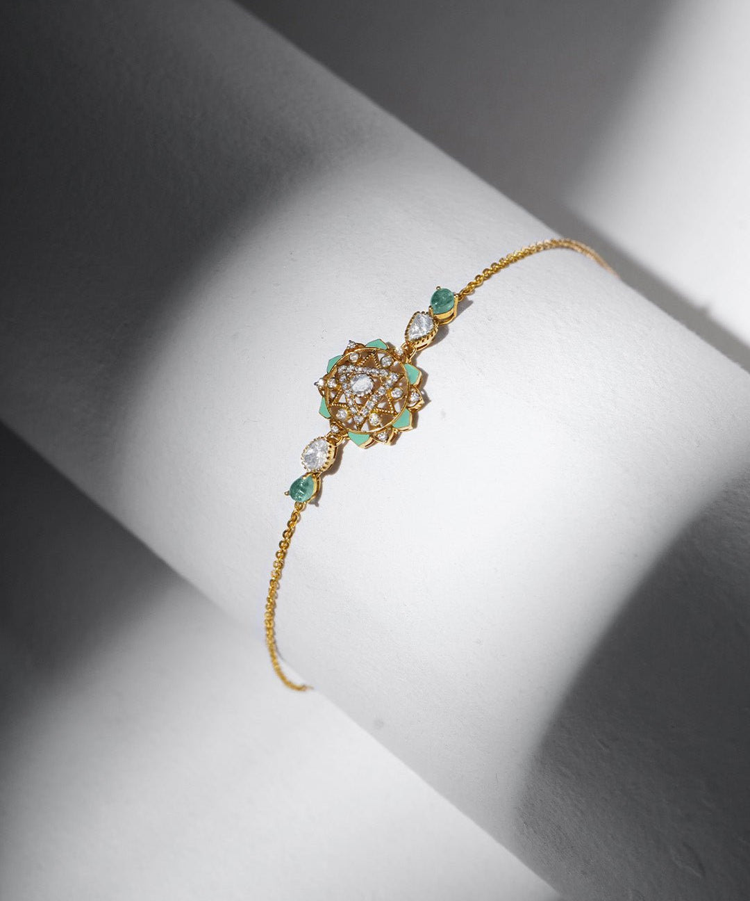 A poetic blend of tradition and modernity, this 18k gold ring features Polki and brilliant-cut diamonds in a sculptural floral silhouette. Blush enamel detailing adds a dreamy, dawn-like glow — a delicate statement of elegance and romance.