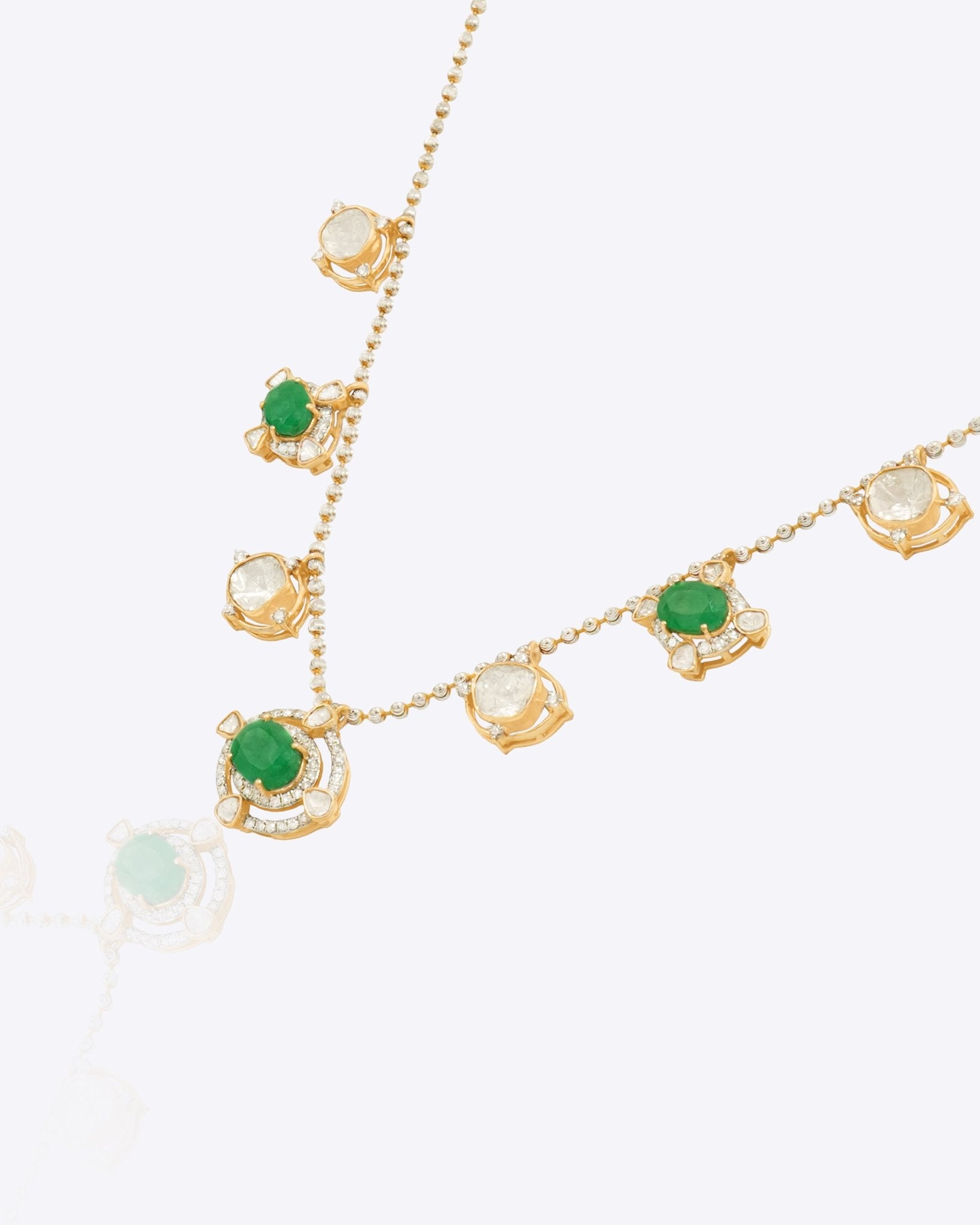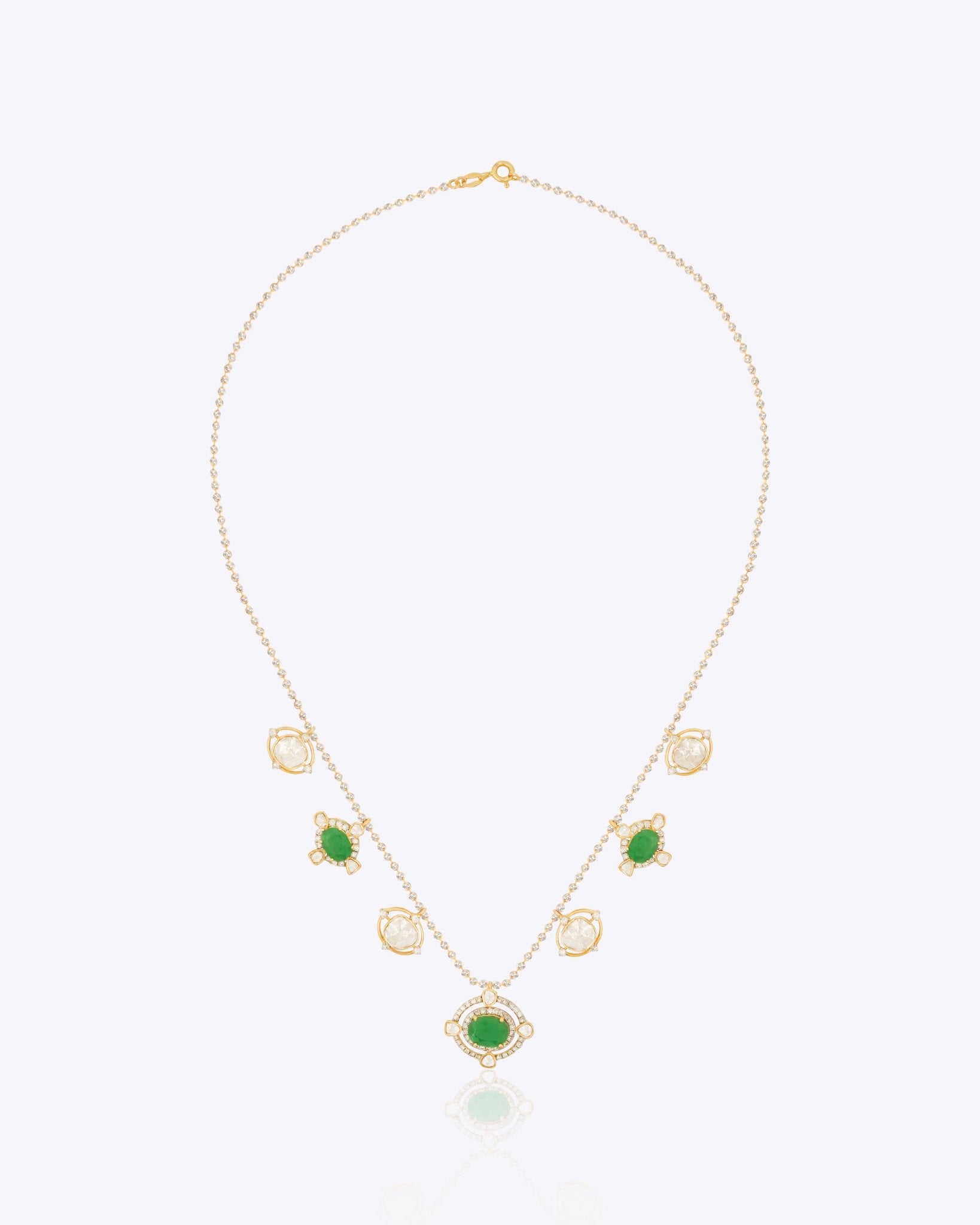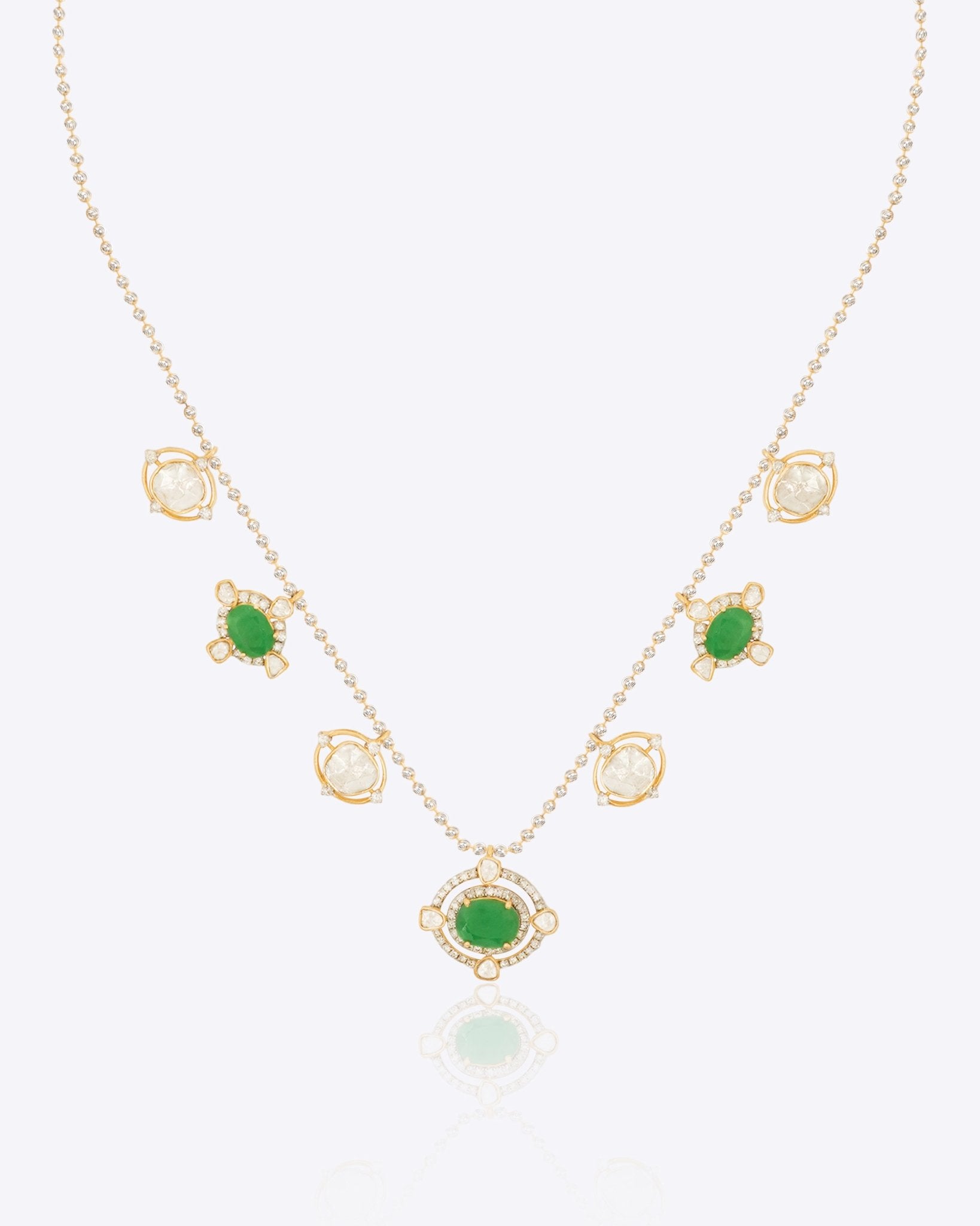 This 18K gold necklace features a seamless flow of Polki diamonds and Aventurine, forming an elegant drape of sparkle and serenity. Perfectly balanced in design and detail.