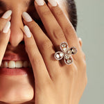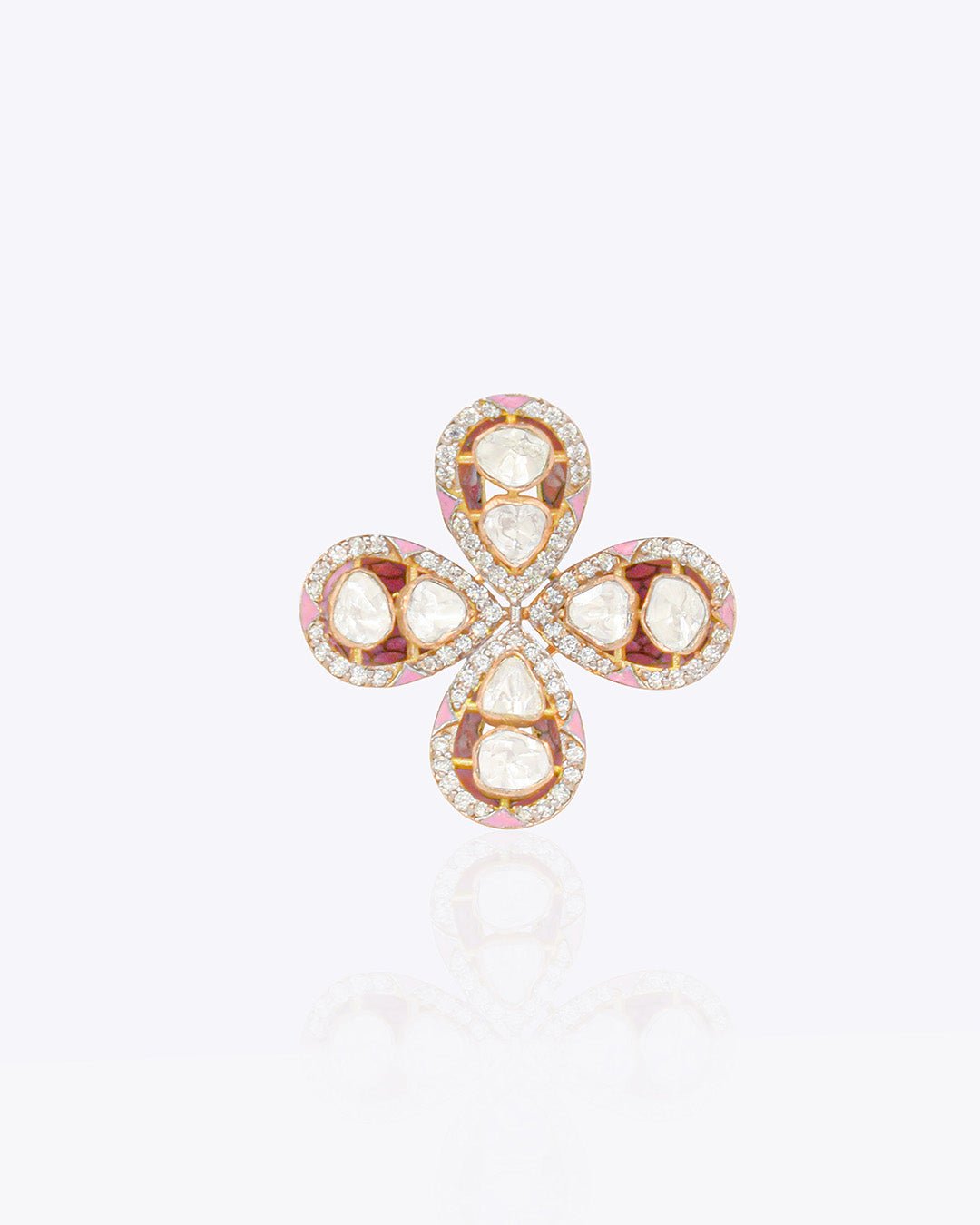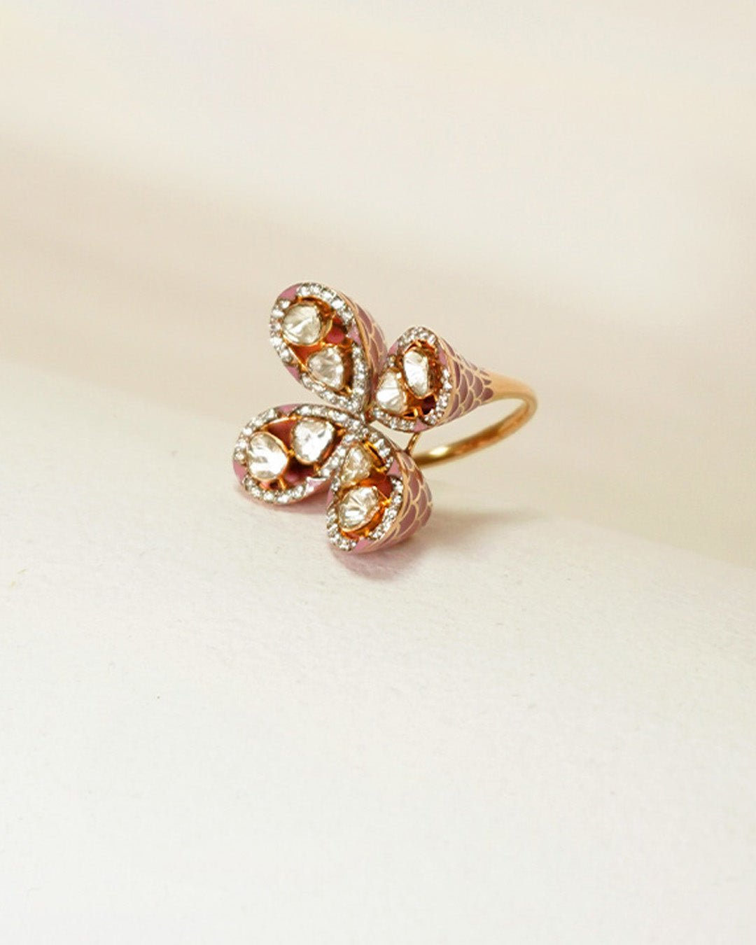 A floral statement, this 18k gold ring is adorned with vintage Polki and brilliant-cut diamonds. With its romantic silhouette and regal detailing, it bridges timeless tradition and modern elegance.