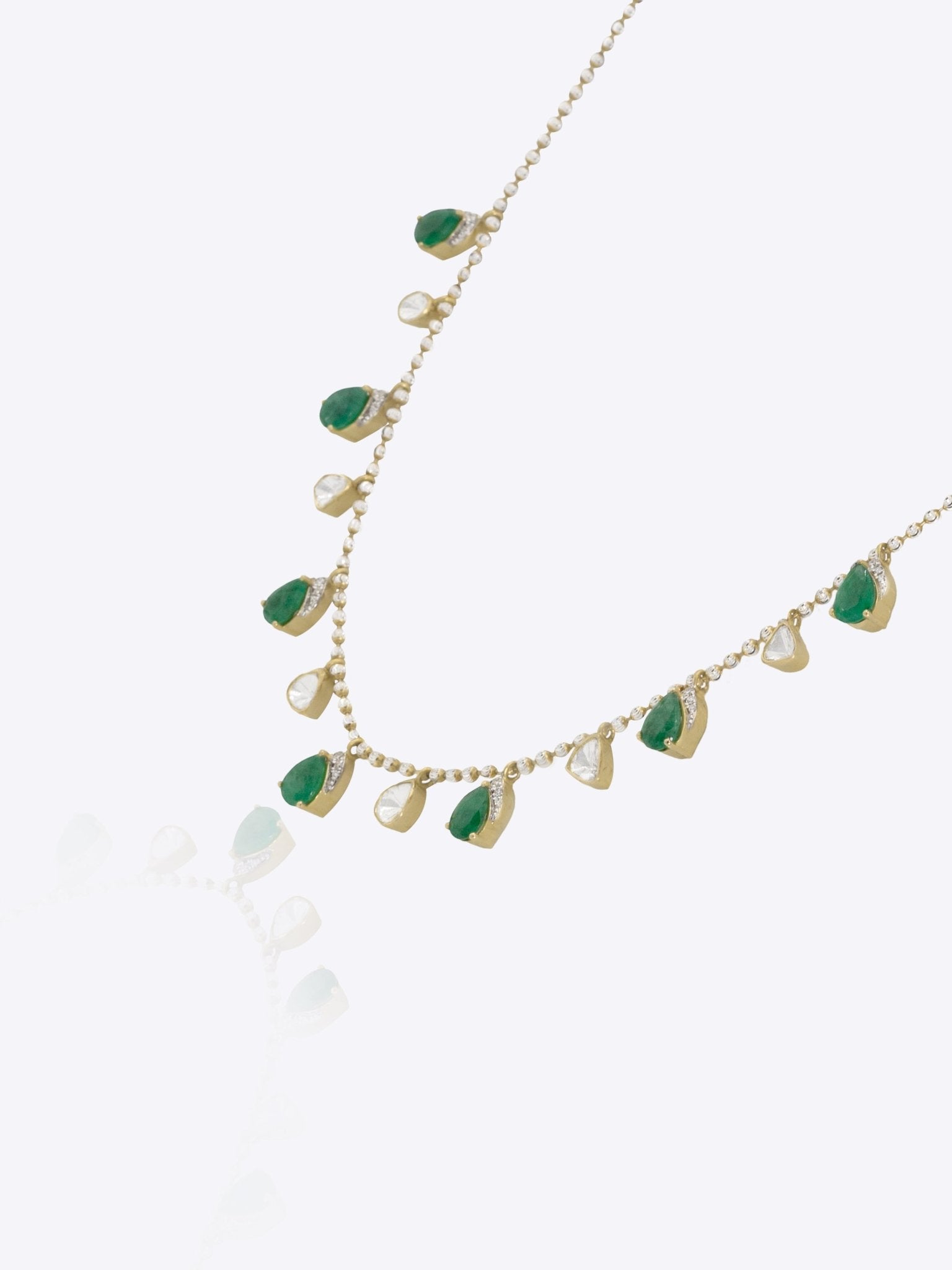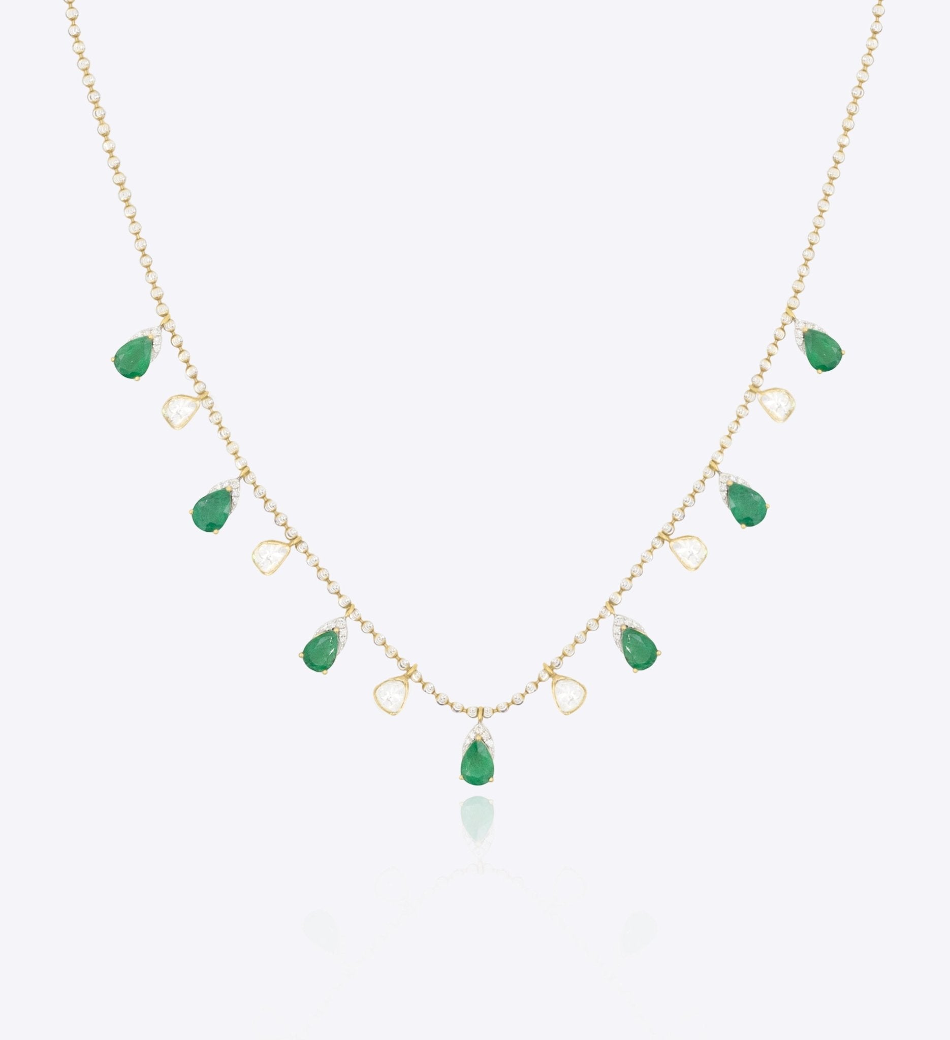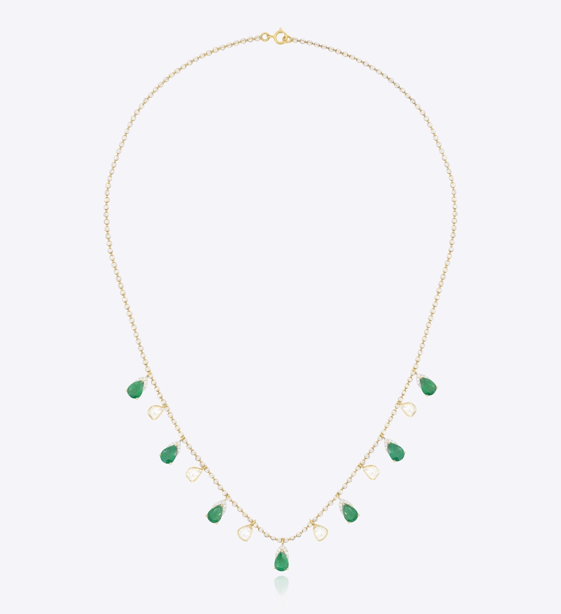 Bring a touch of refined glamour to any occasion with the Emerald Dreams Polki Diamond Necklace. Its versatile design blends radiant polki diamonds with lush emerald tones perfect for festive celebrations, soires, or evening affairs.