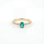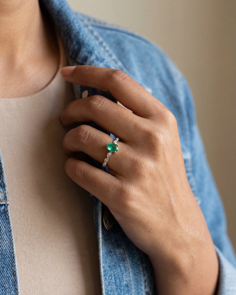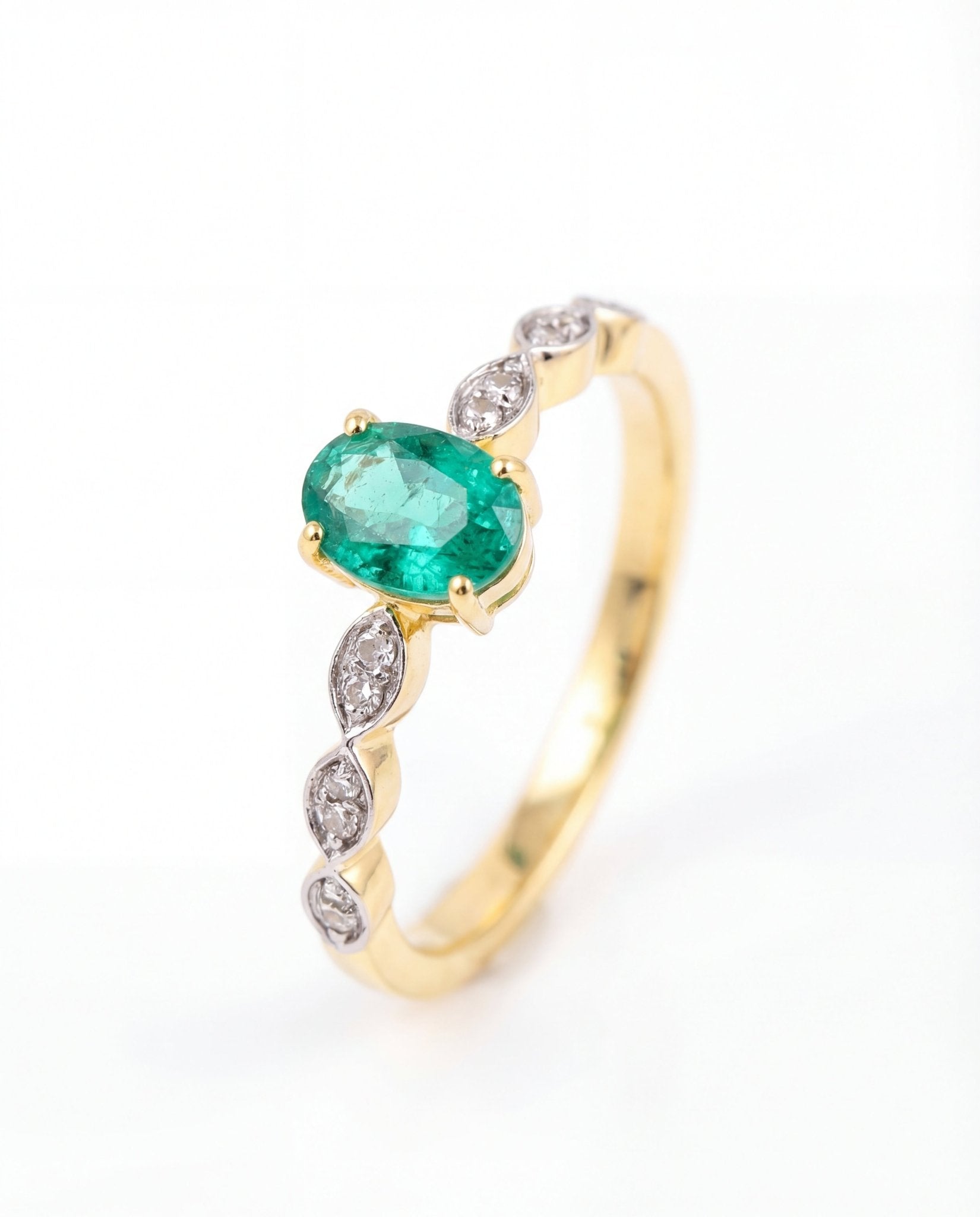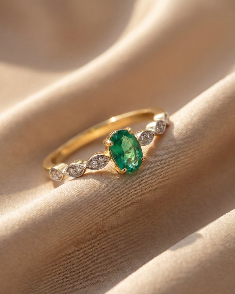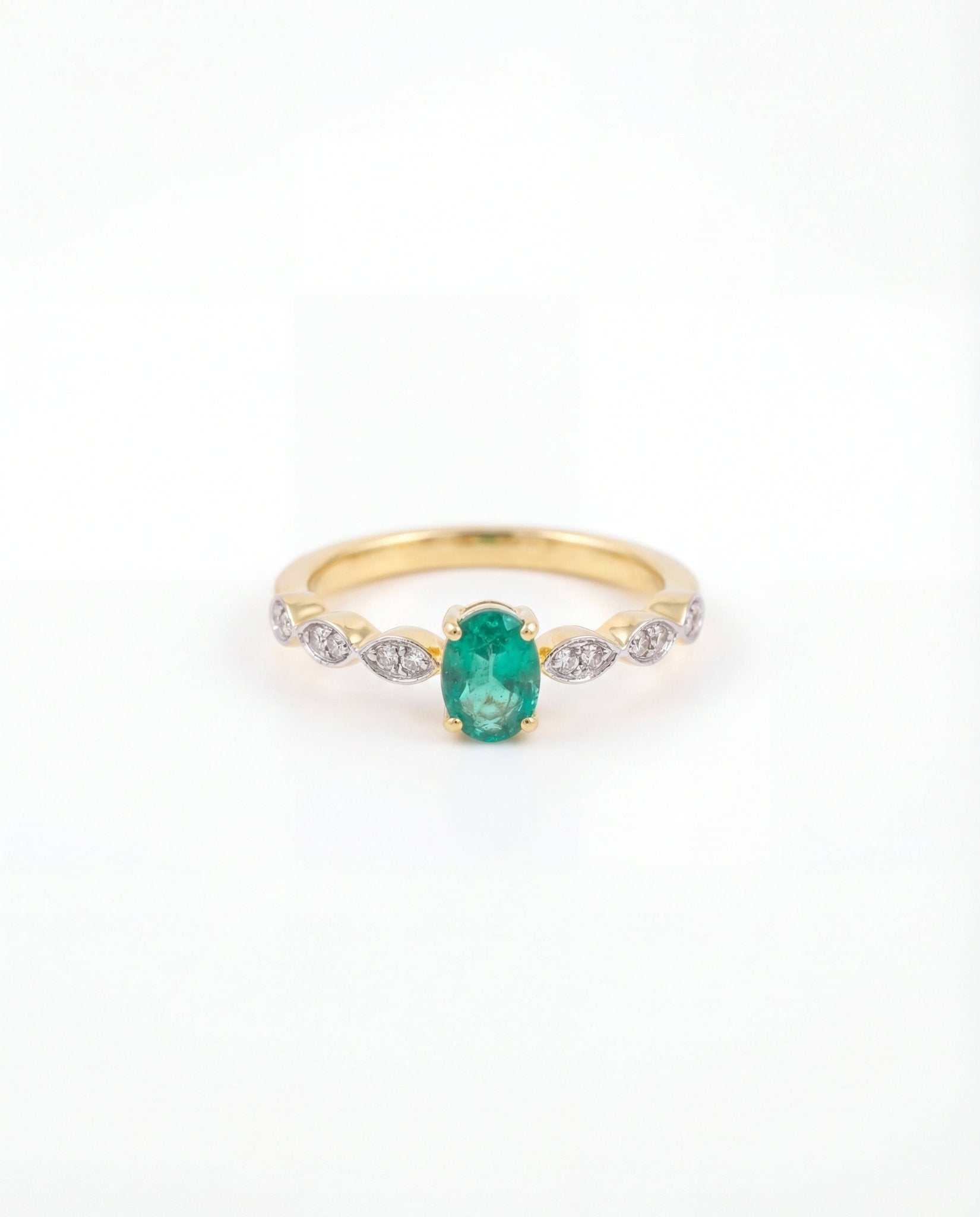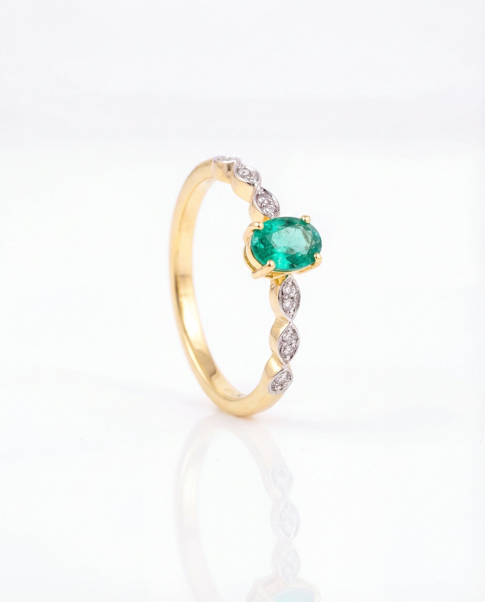The Emerald Radiance Ring features a vivid emerald framed by dazzling diamonds, set in 14k gold. A striking piece that balances elegance with bold allure.