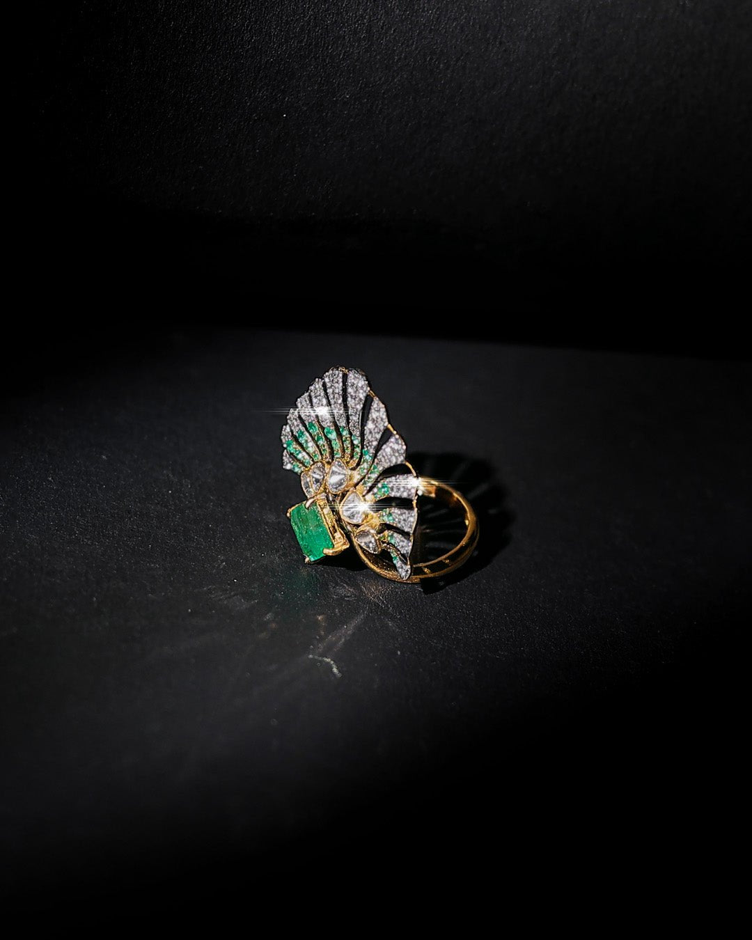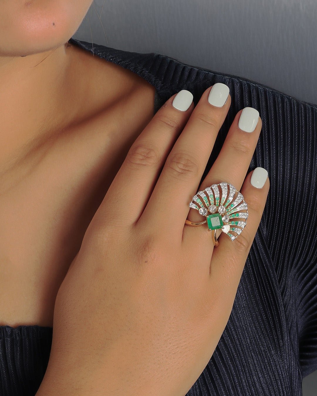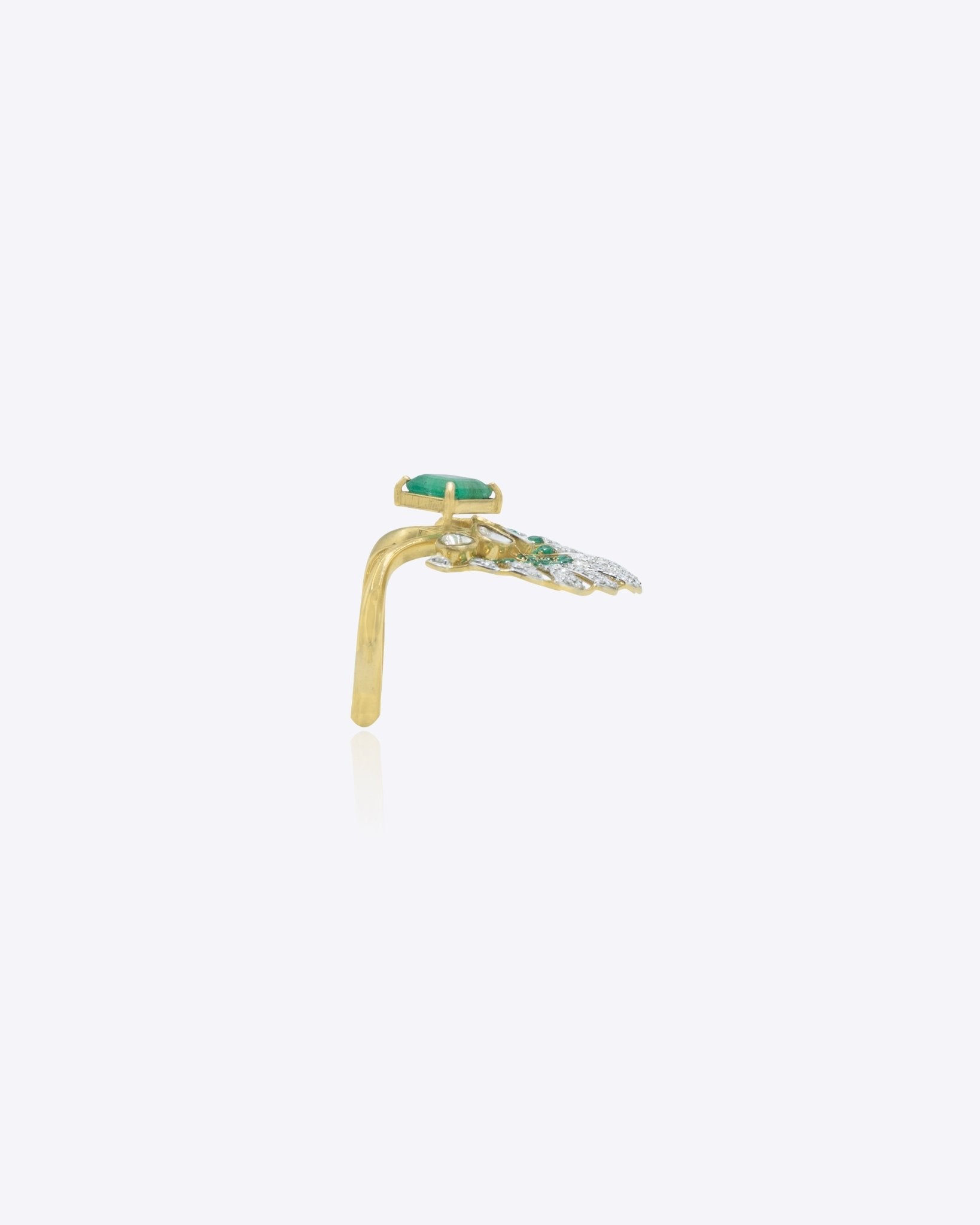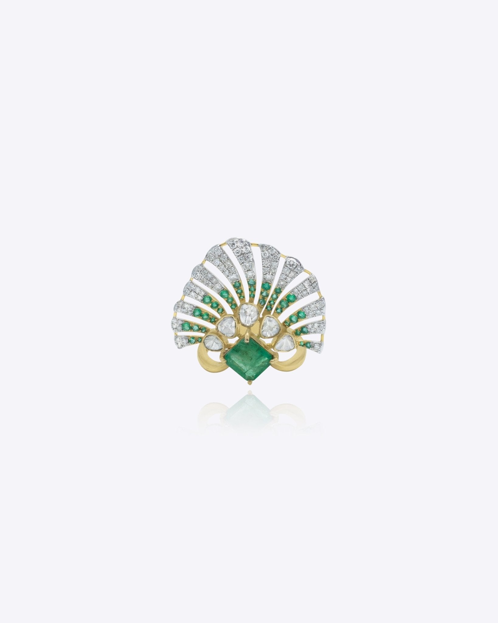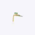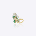 Crafted in 14K gold, the Floret Flare Ring features a vibrant emerald with radiating accents, creating a bold and luminous statement piece.