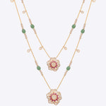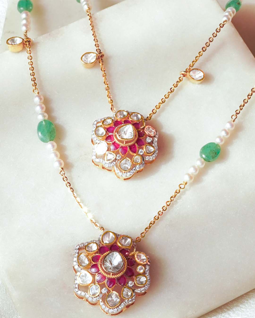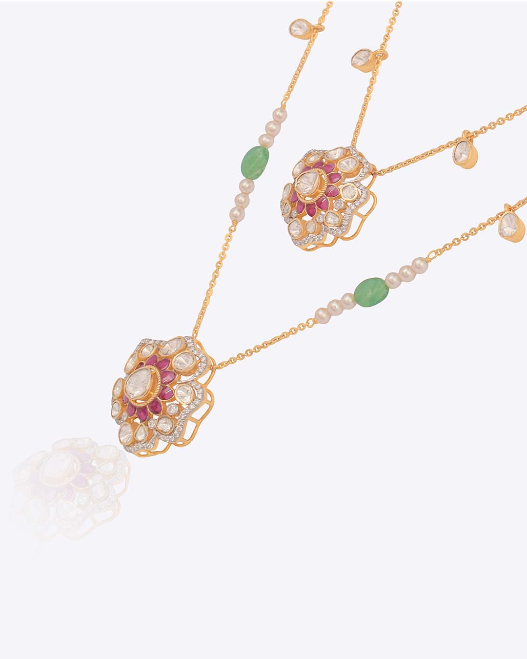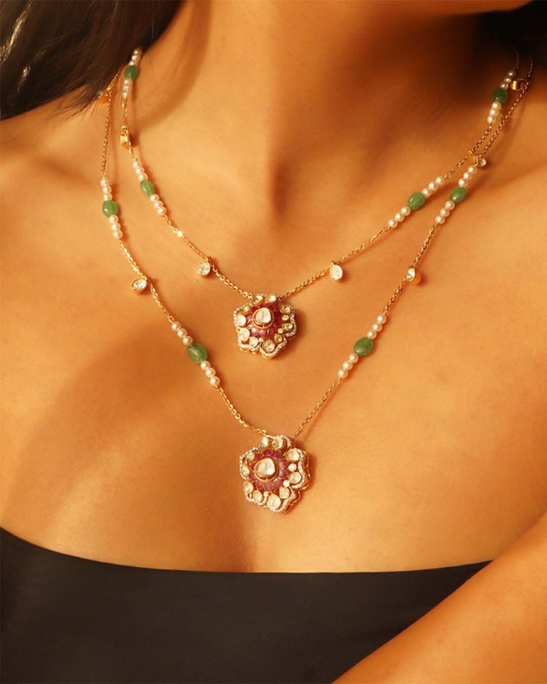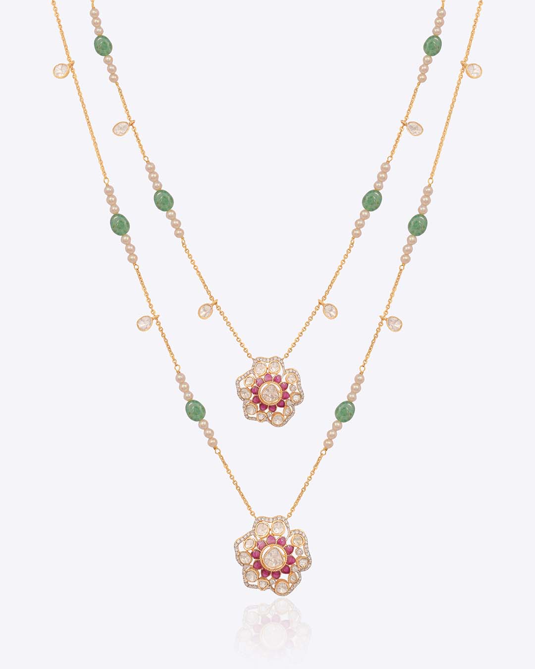 This romantic and graceful, 14k gold necklace showcases floral Polki pendants on a double-layered chain dotted with emerald beads. Soft details and gentle sparkle bring timeless charm.