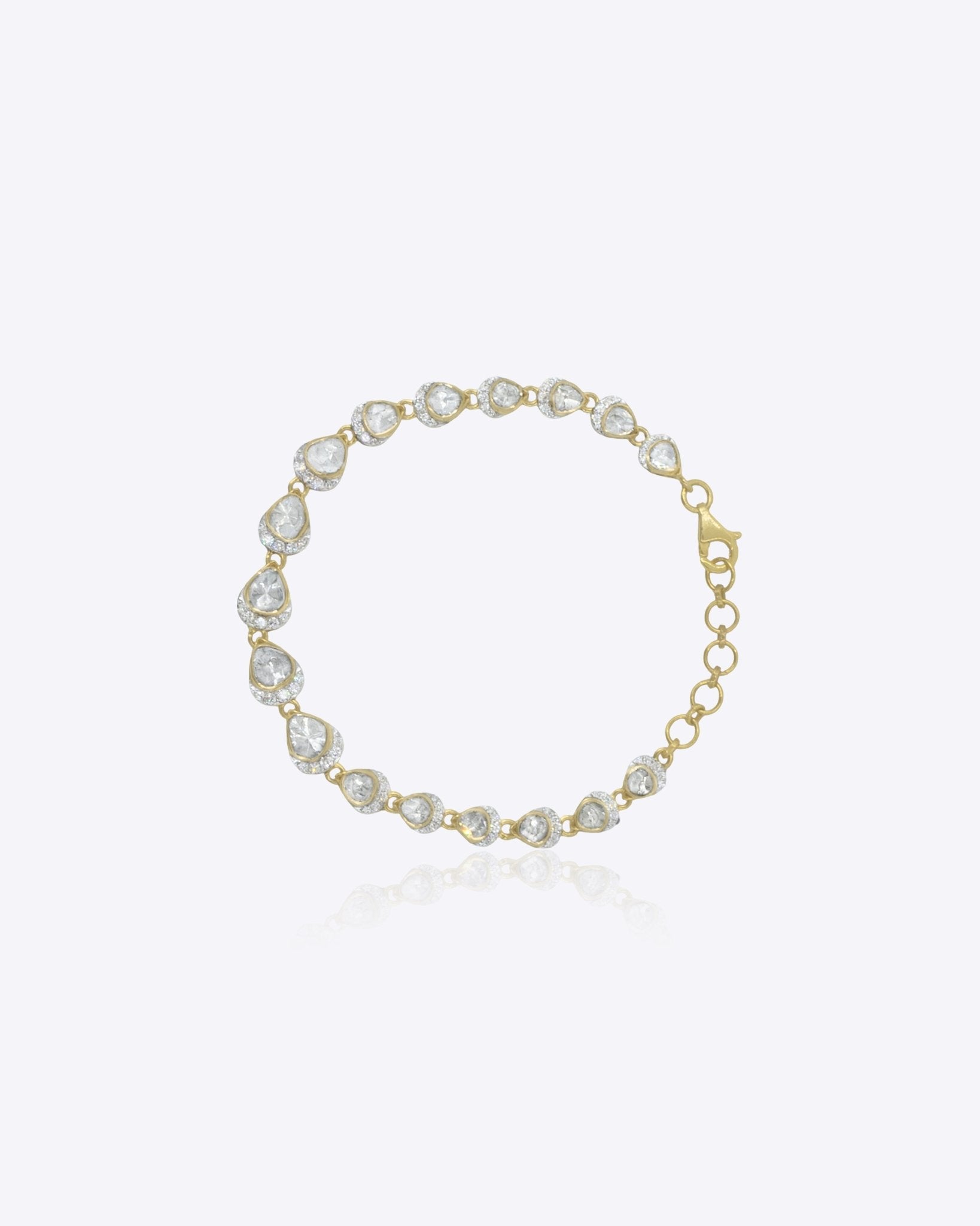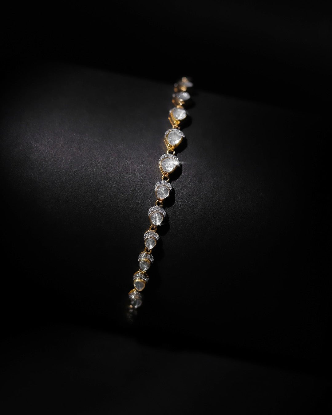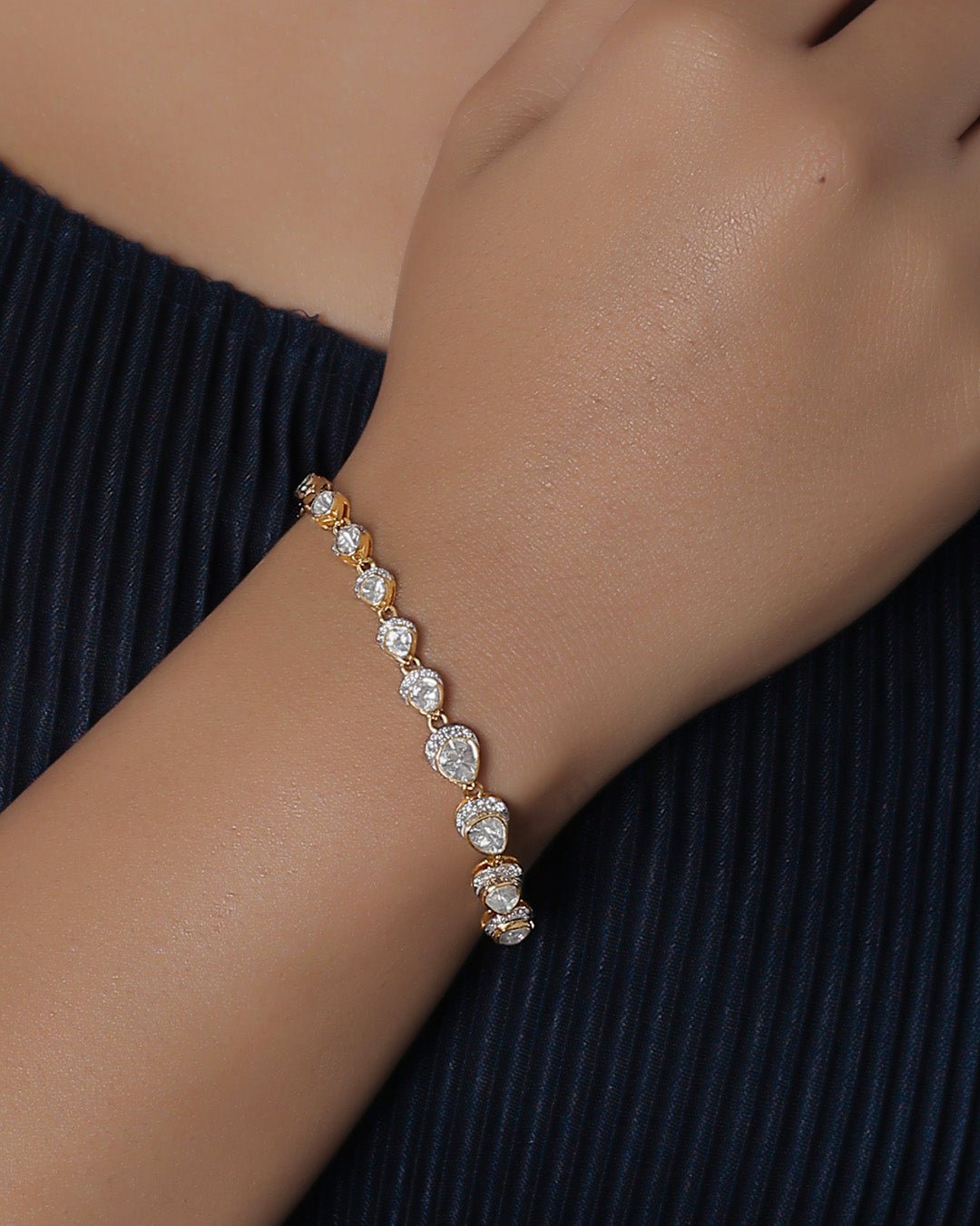 Crafted in 14K gold, this bracelet showcases oval Polki accents complemented by subtle diamond detailing, offering a graceful balance of tradition and modern style.