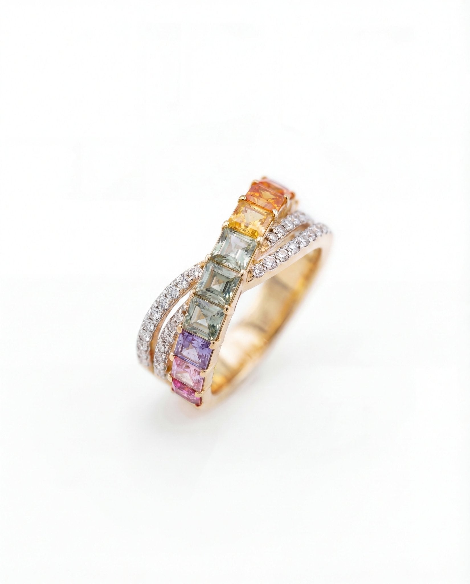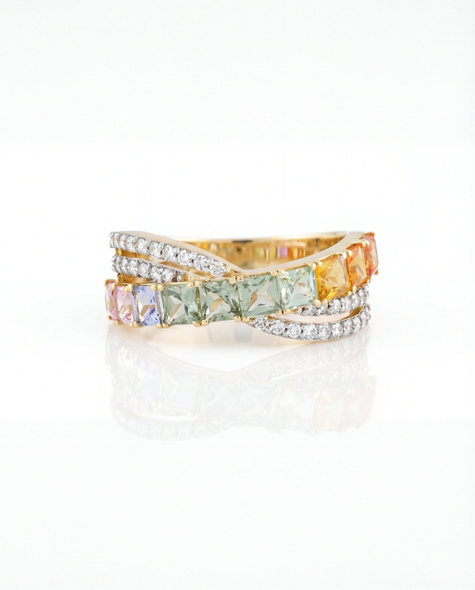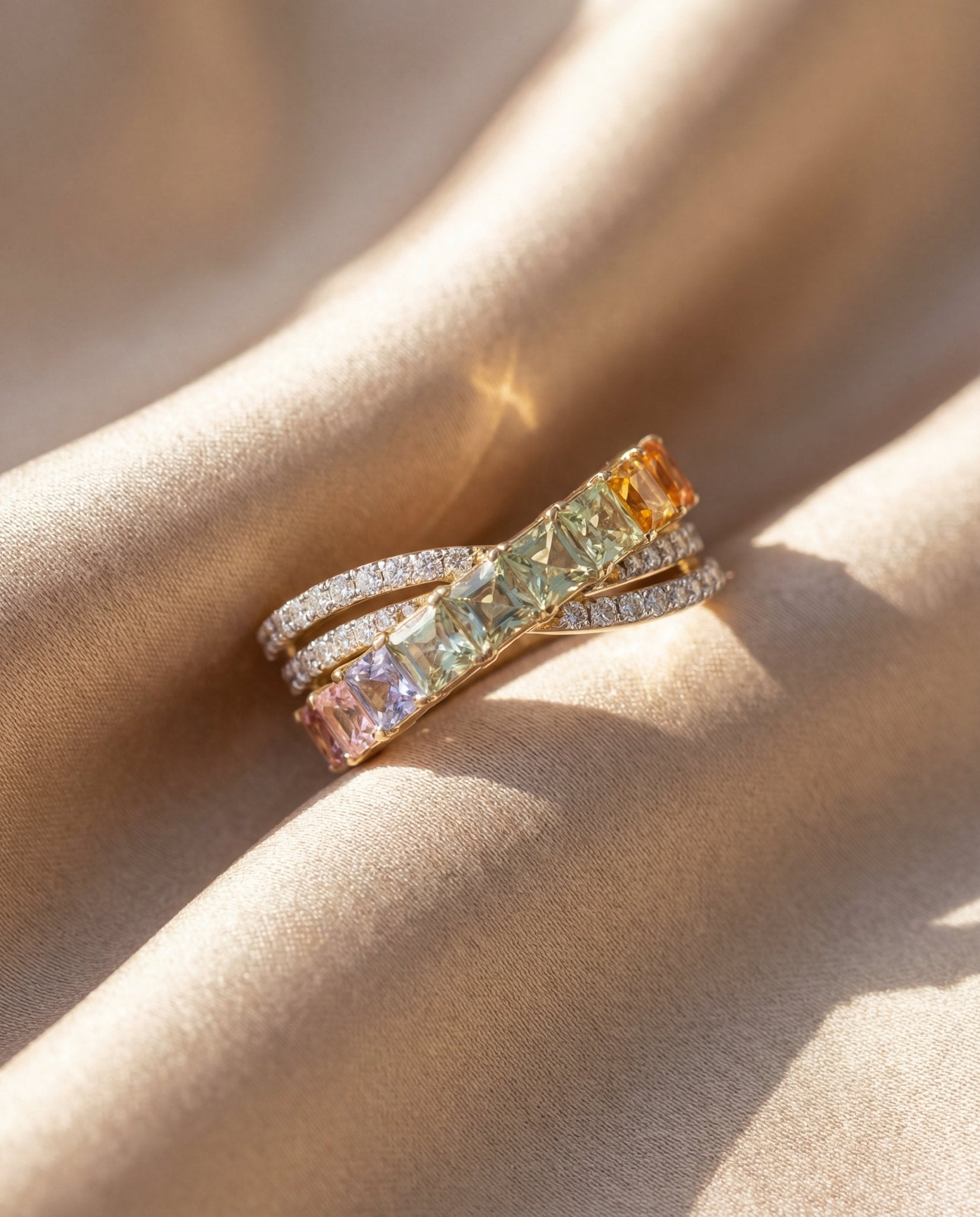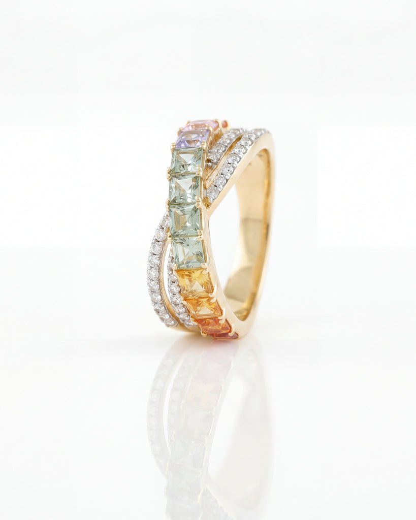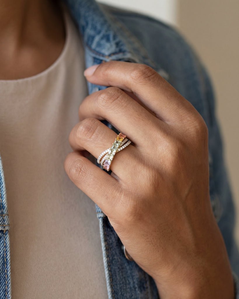 The Luxe Multi Sapphire Ring blends vibrant sapphires with sparkling diamonds, set in 14k gold. Its colorful array radiates brilliance, bringing playful elegance to any look.