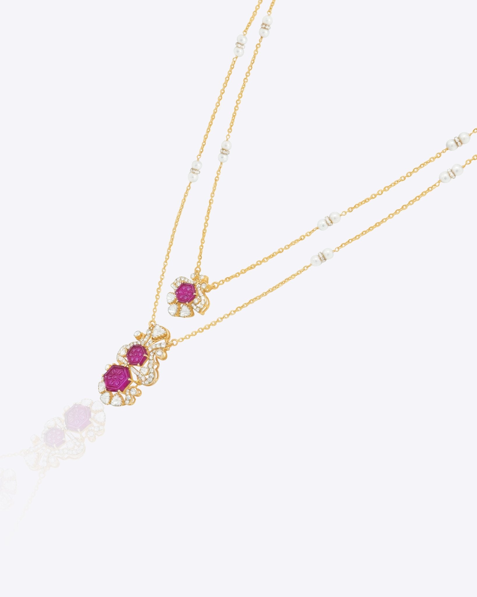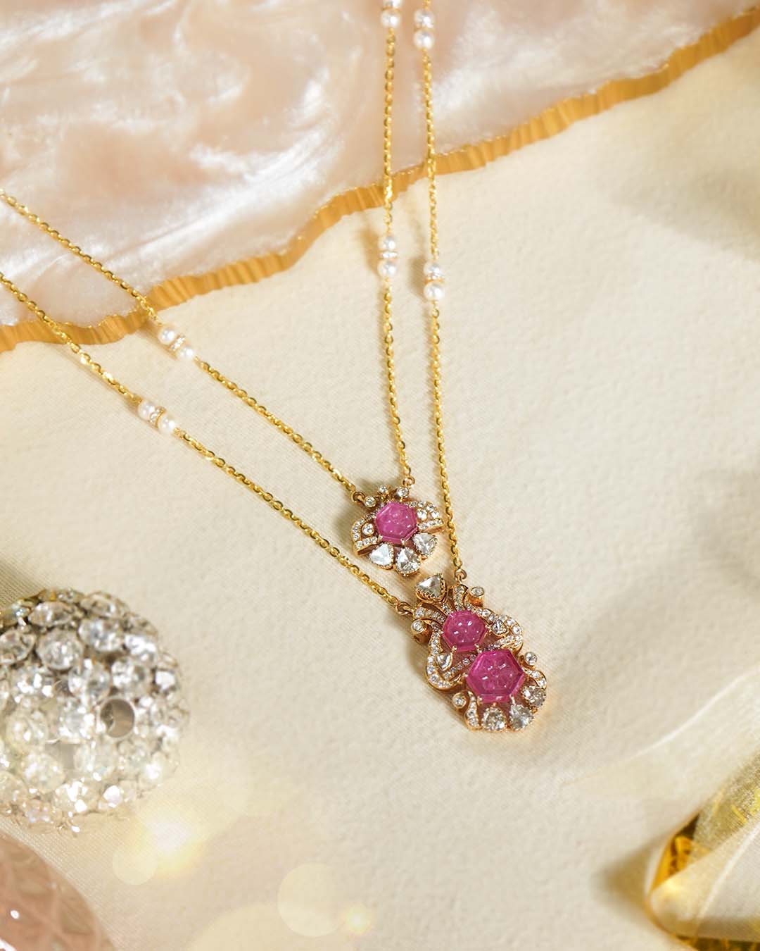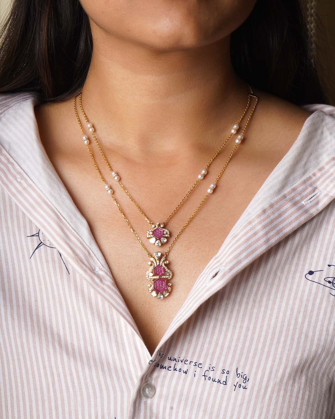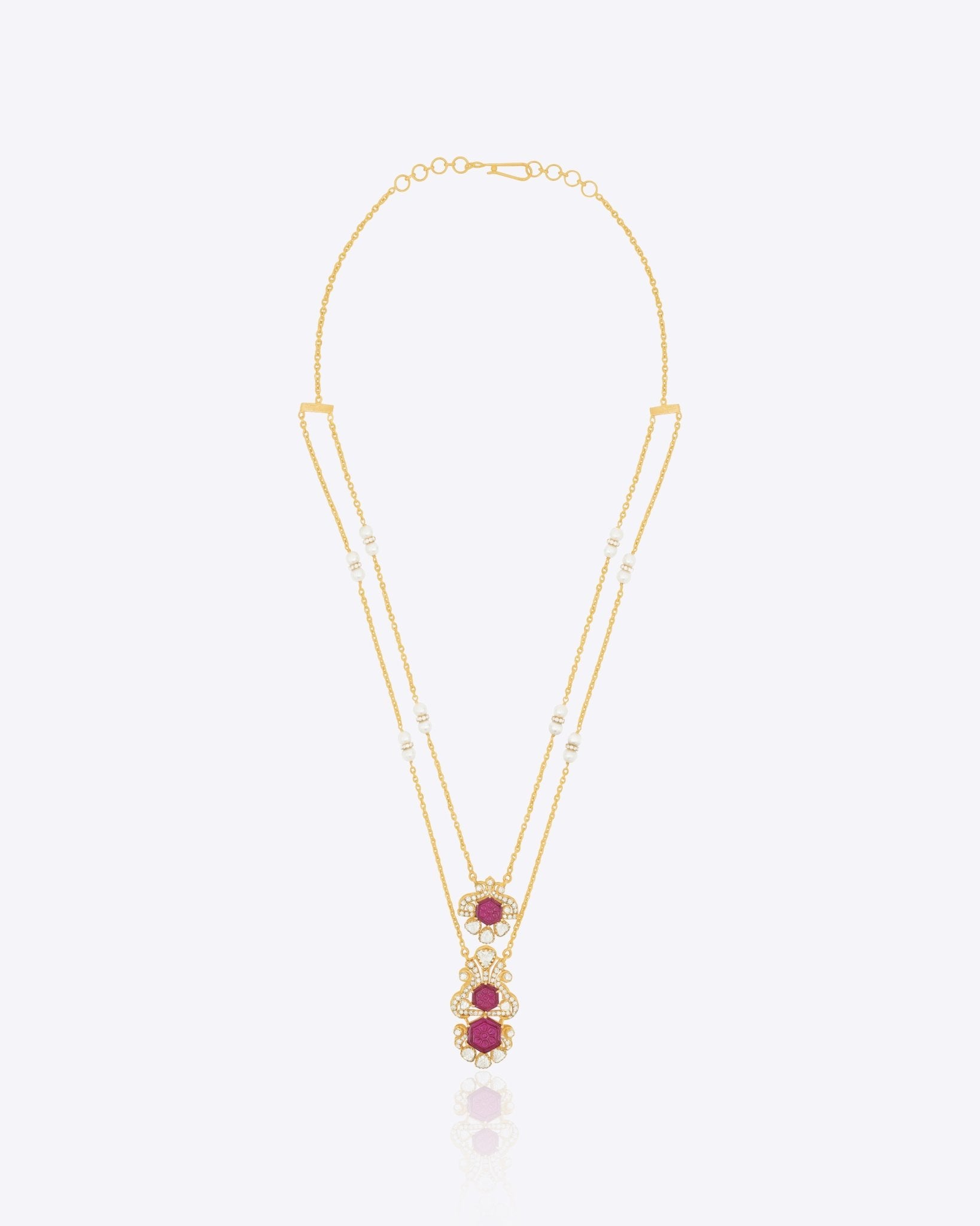 Intricate carvings and Polki diamonds meet in this ruby studded 14k gold creation, echoing timeless Mughal artistry. A jewel of heritage reimagined for today.