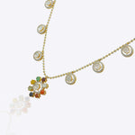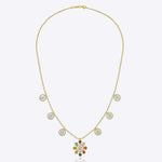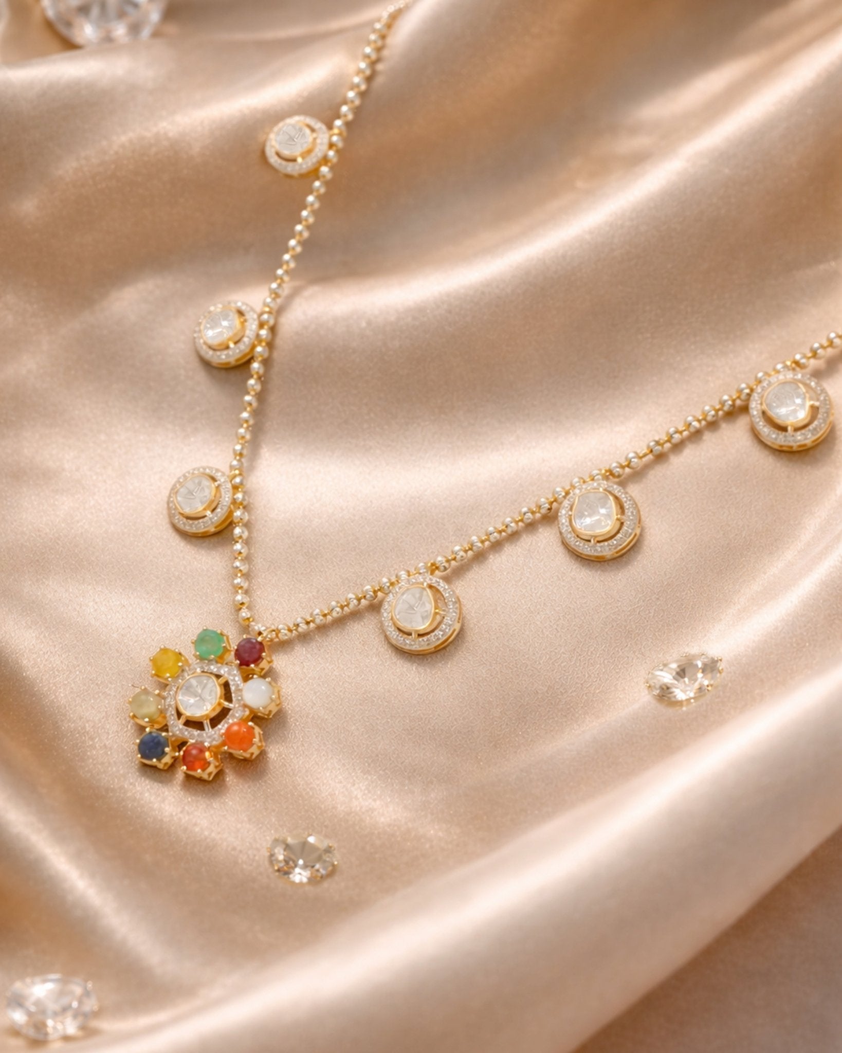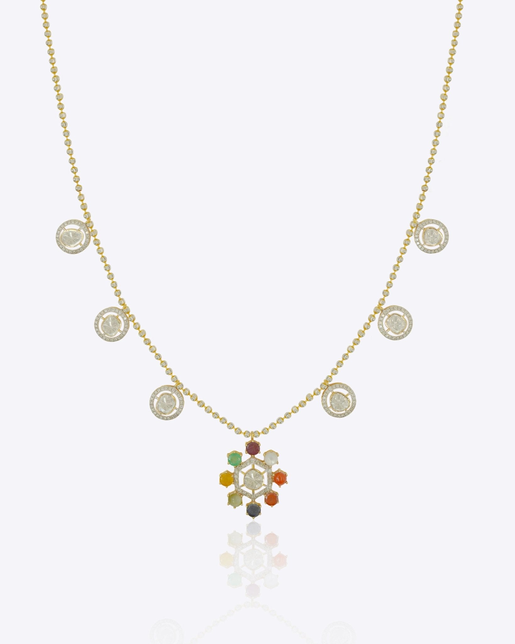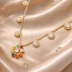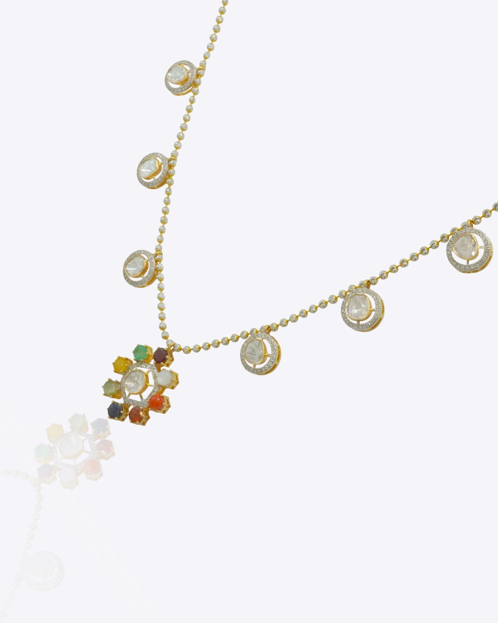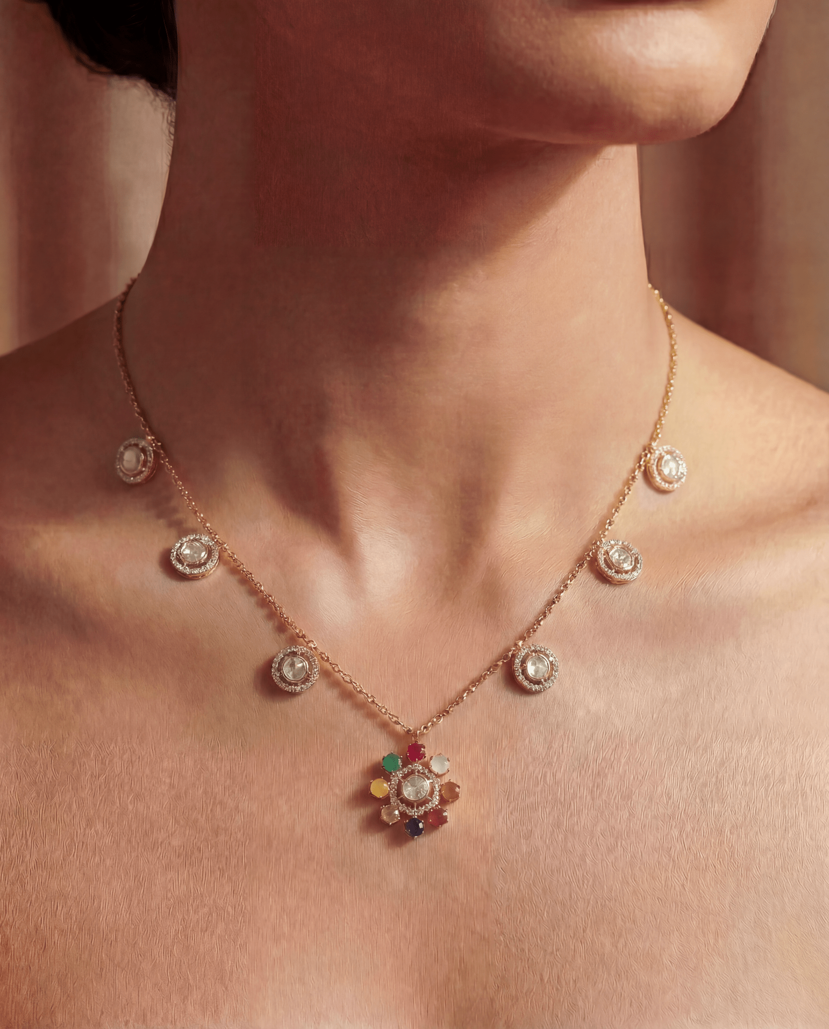 Centred in a radiant bloom and framed by delicate drops, Navratna Bloom Necklace is sculpted in 18k gold with fluid precision. Graceful, luminous, and intricately composed.