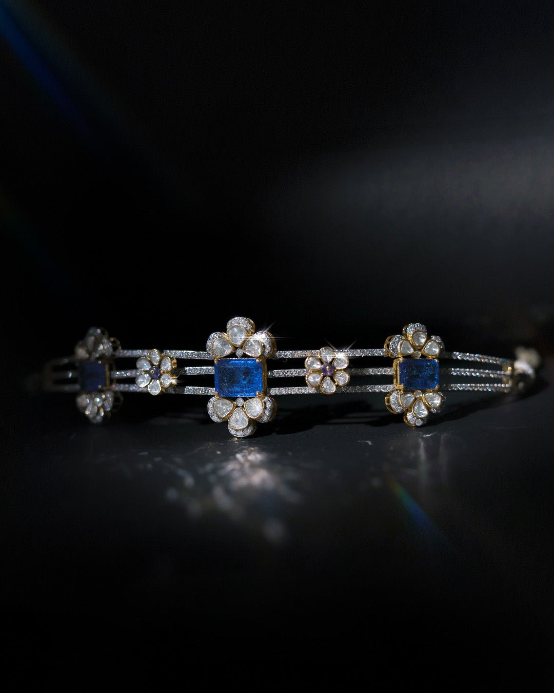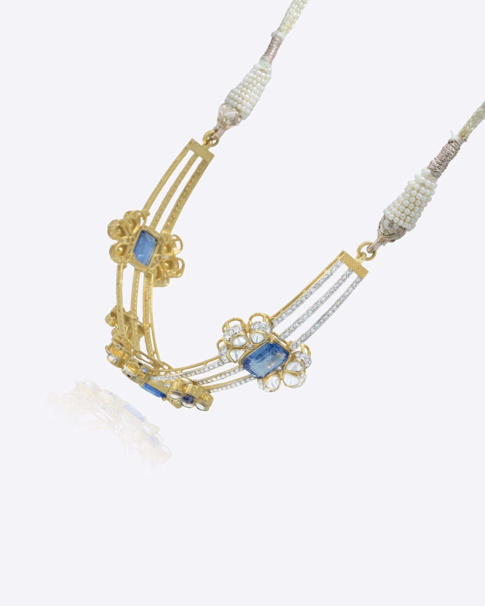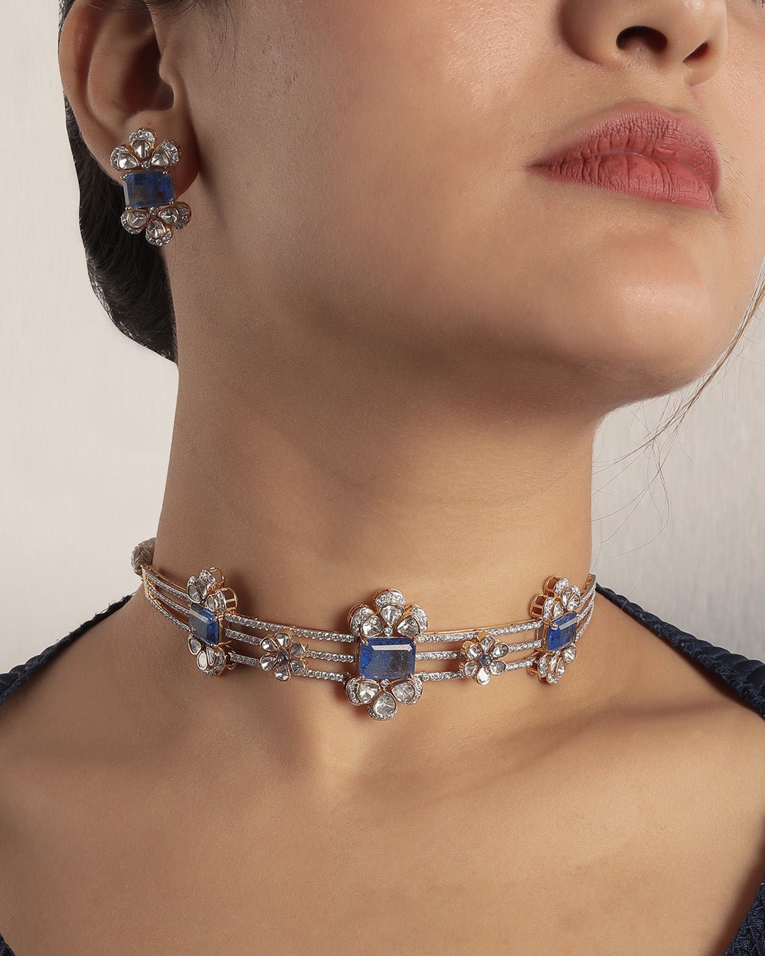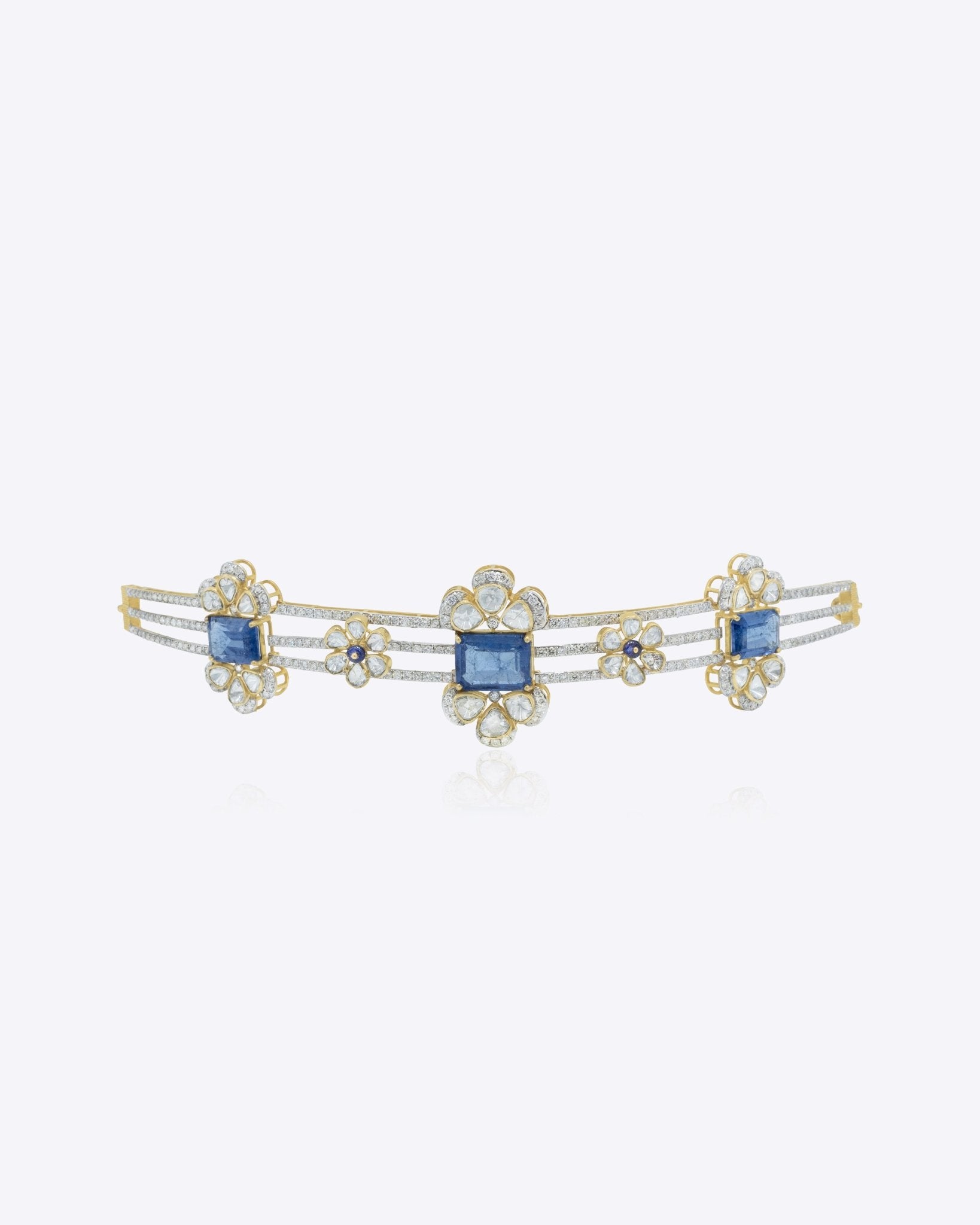 Crafted in 14K gold, the Floré Arc Choker is set with sapphire stones throughout, highlighted by refined Polki detailing for a graceful, statement look.
