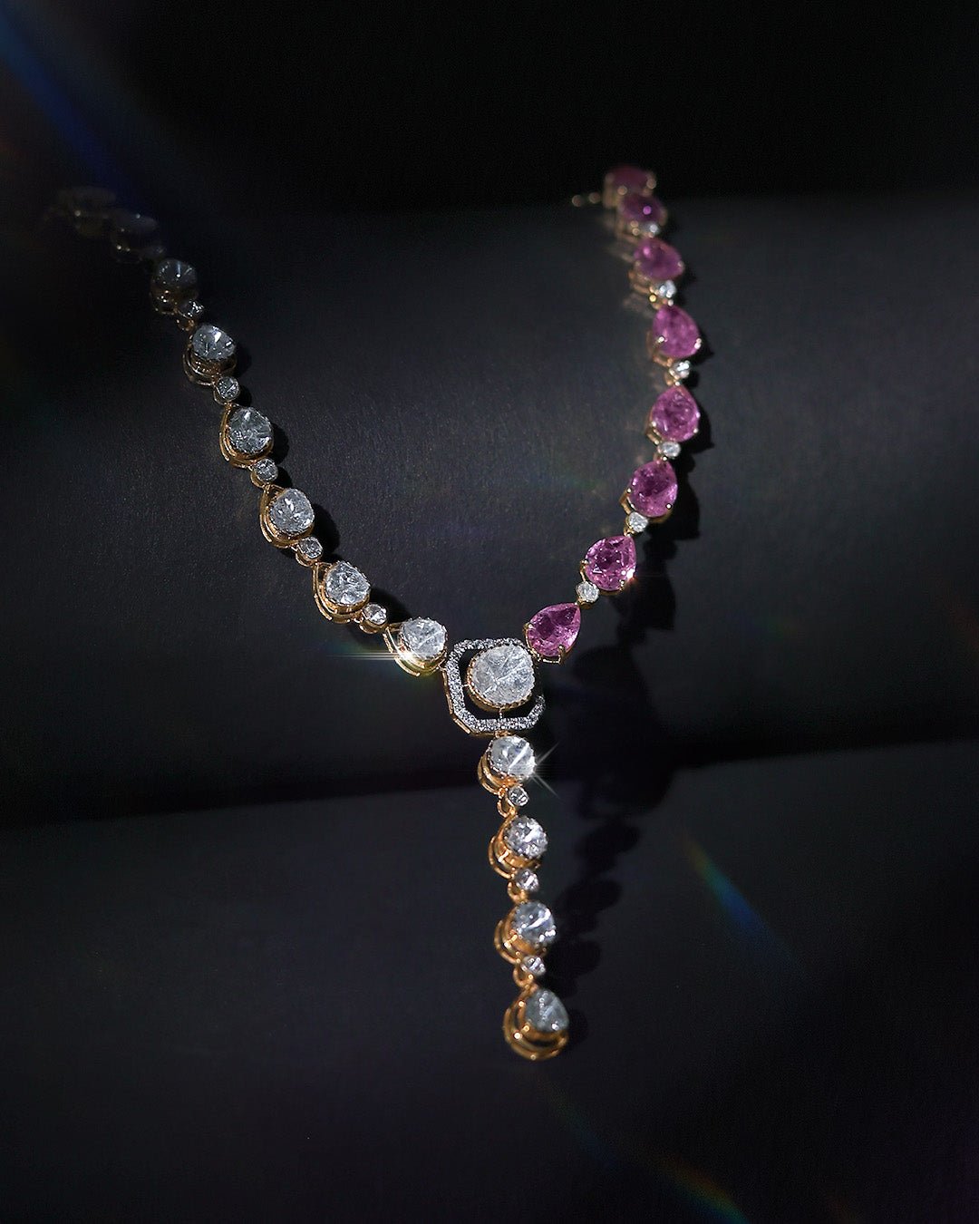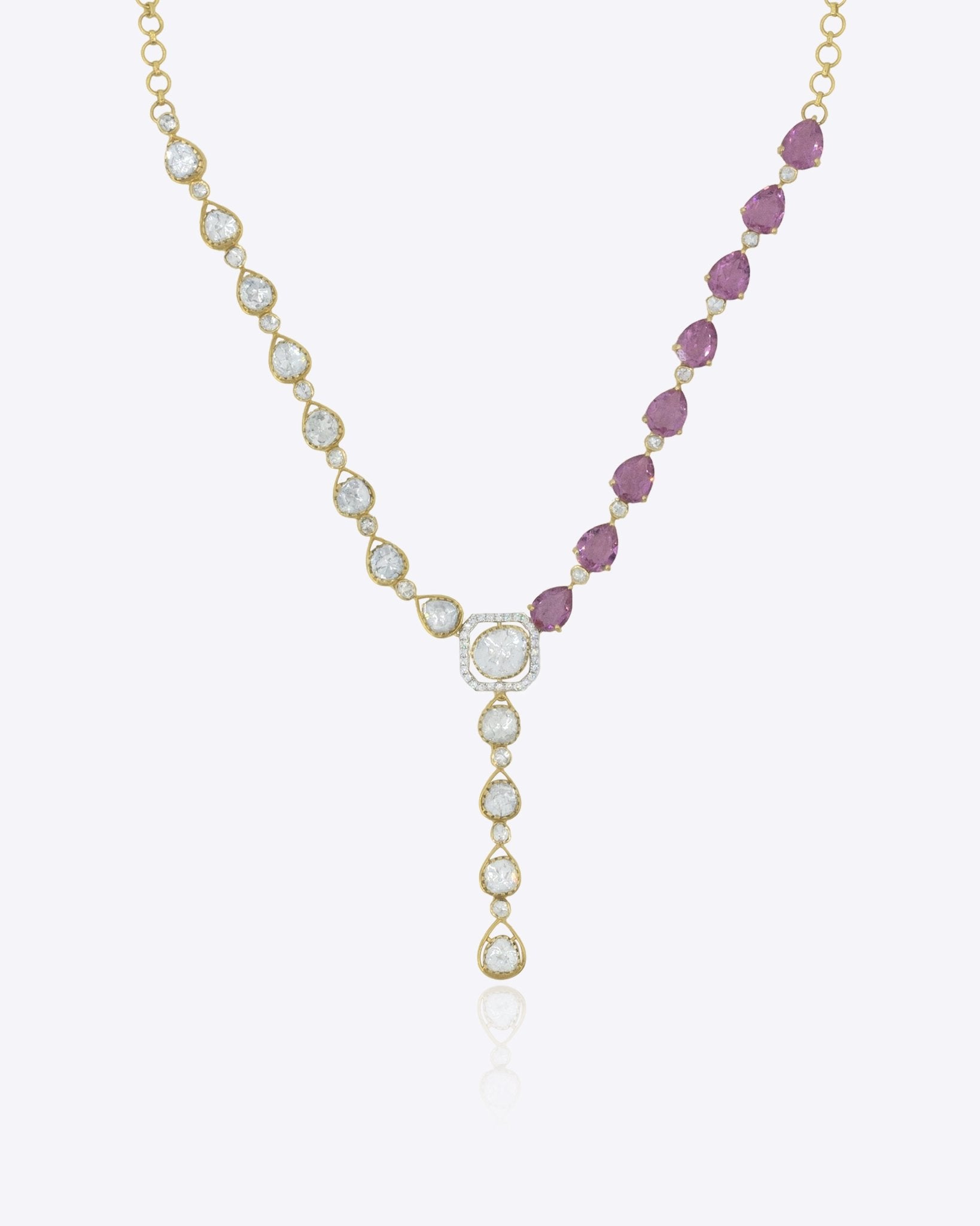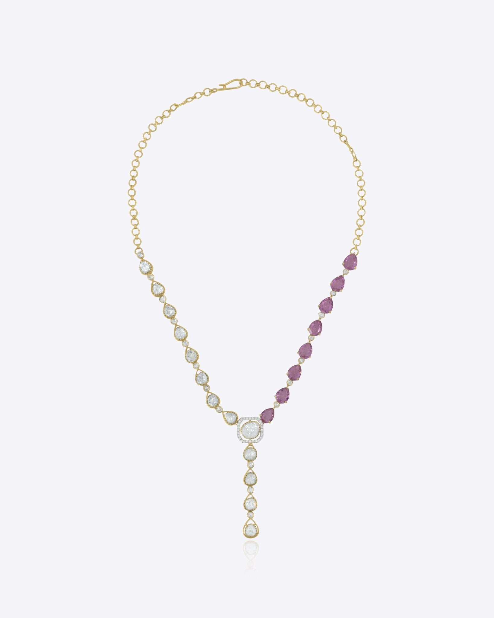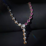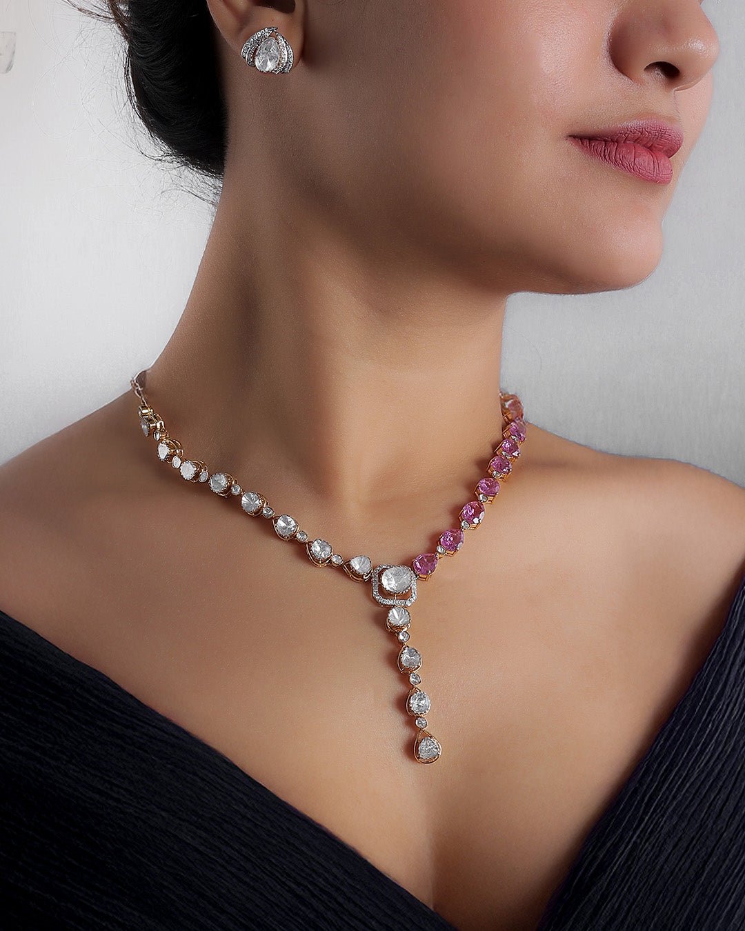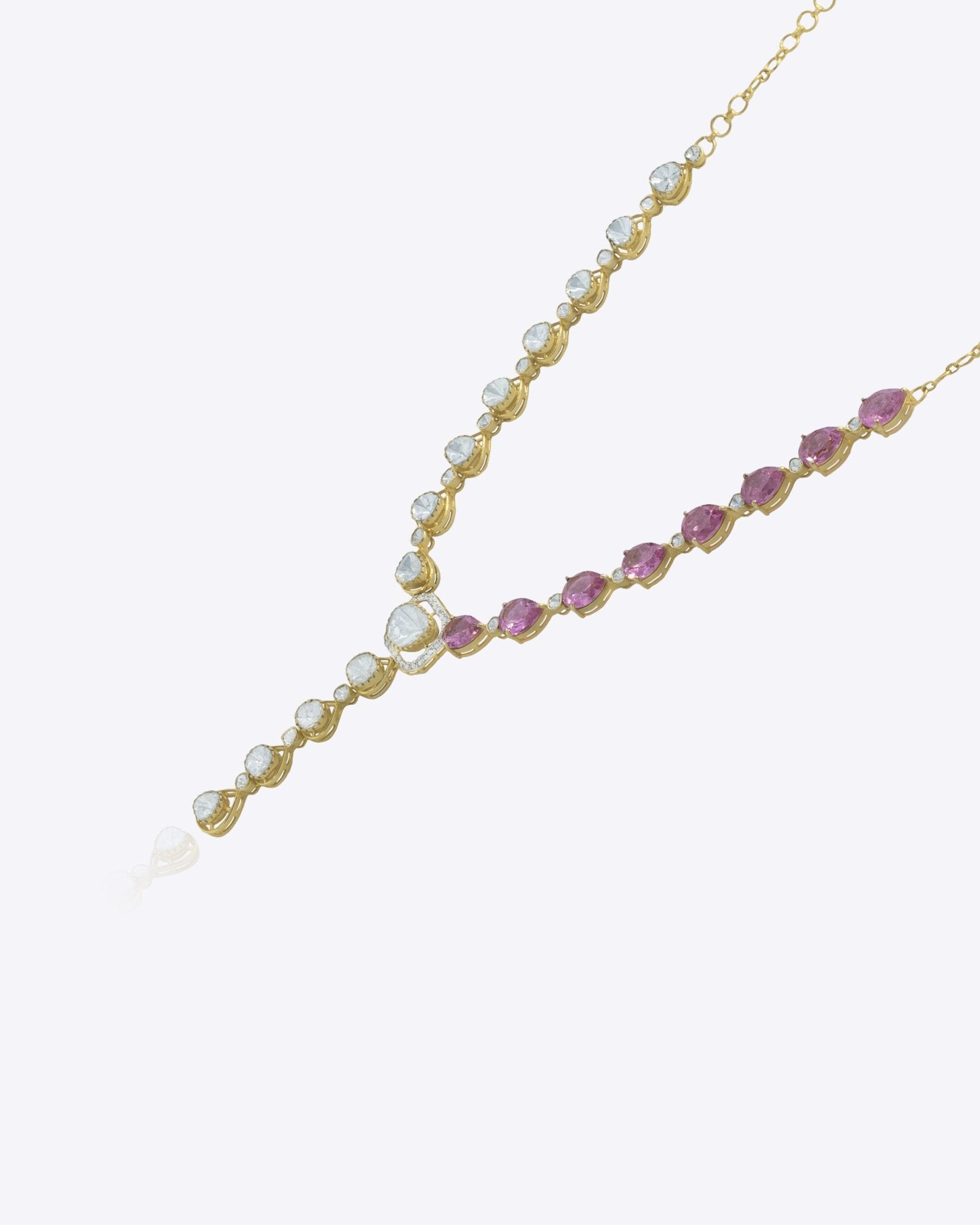 Petalina Polki Necklace in 14K gold, adorned with polki and pink stones for a modern asymmetric charm.