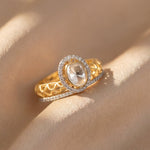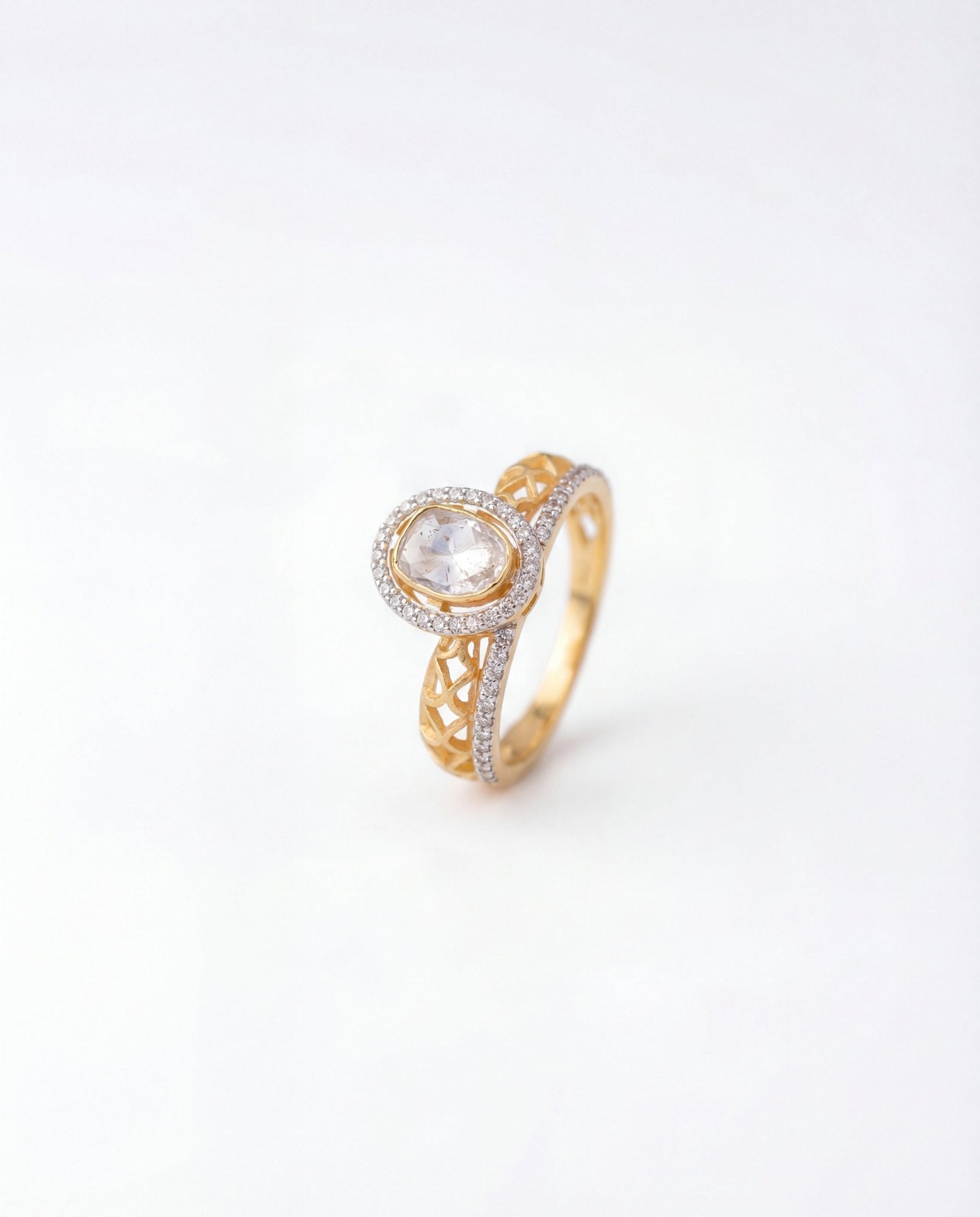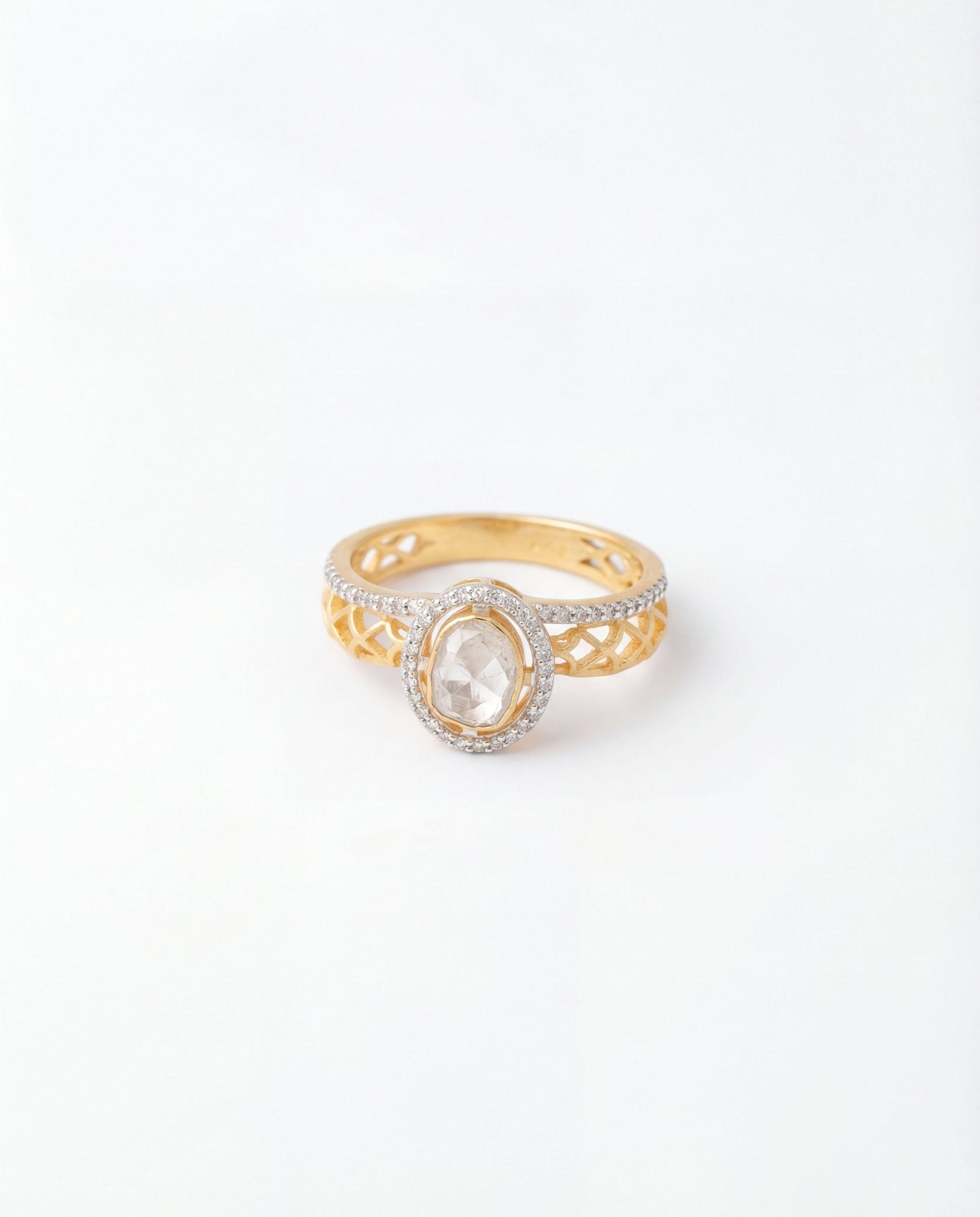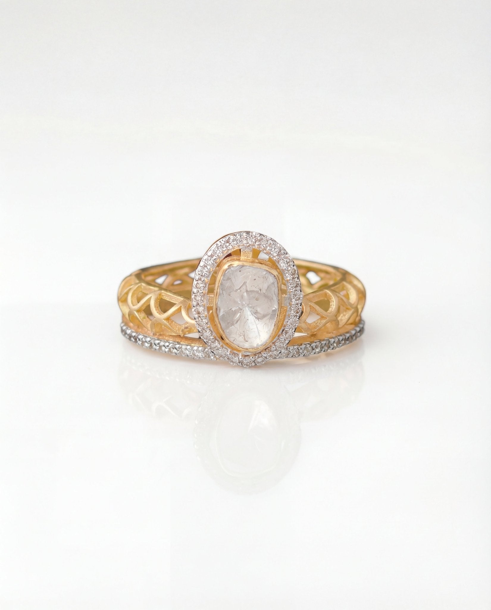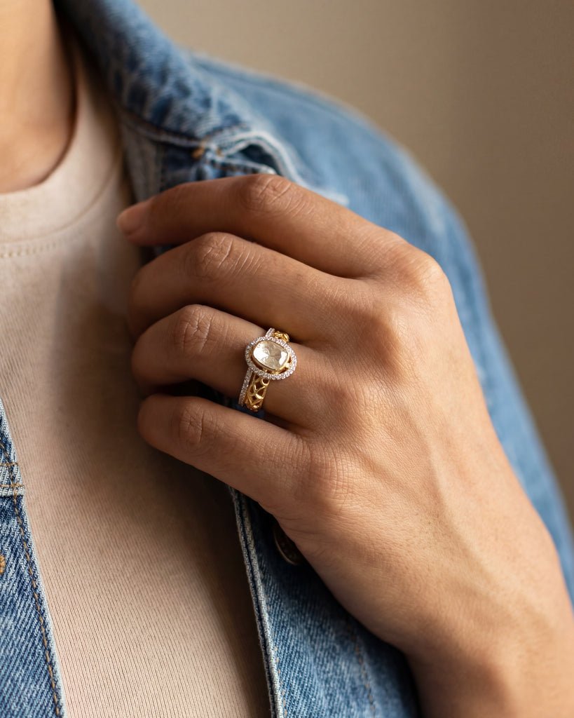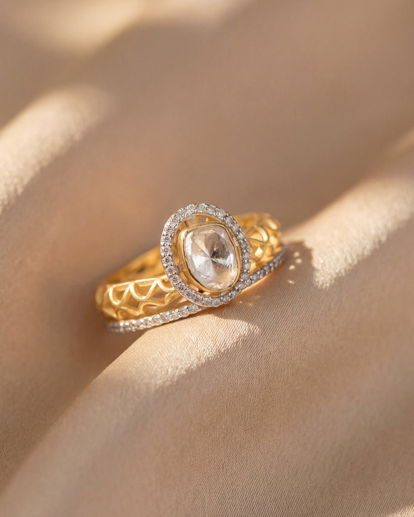 The Polki Moonlit Ring in 18K gold glows with polki diamonds, capturing the serene beauty of moonlight. Elegant and versatile, it’s perfect worn alone or stacked for a bolder look.