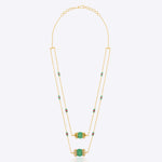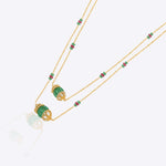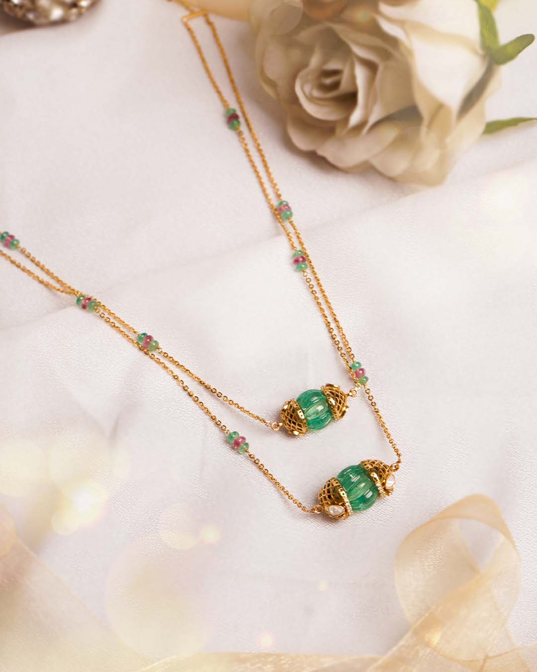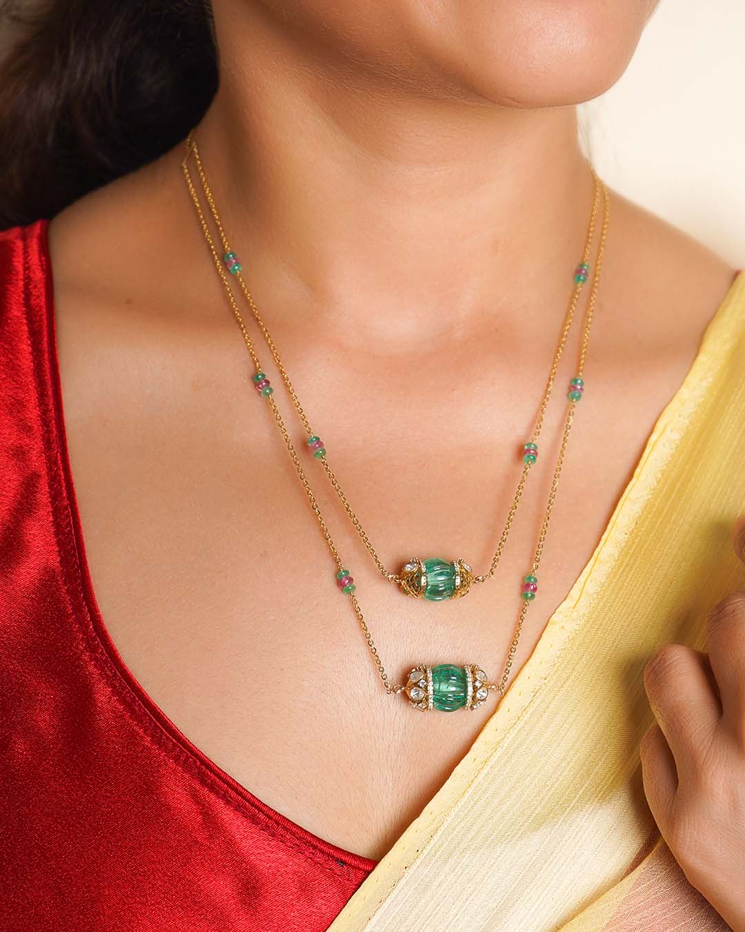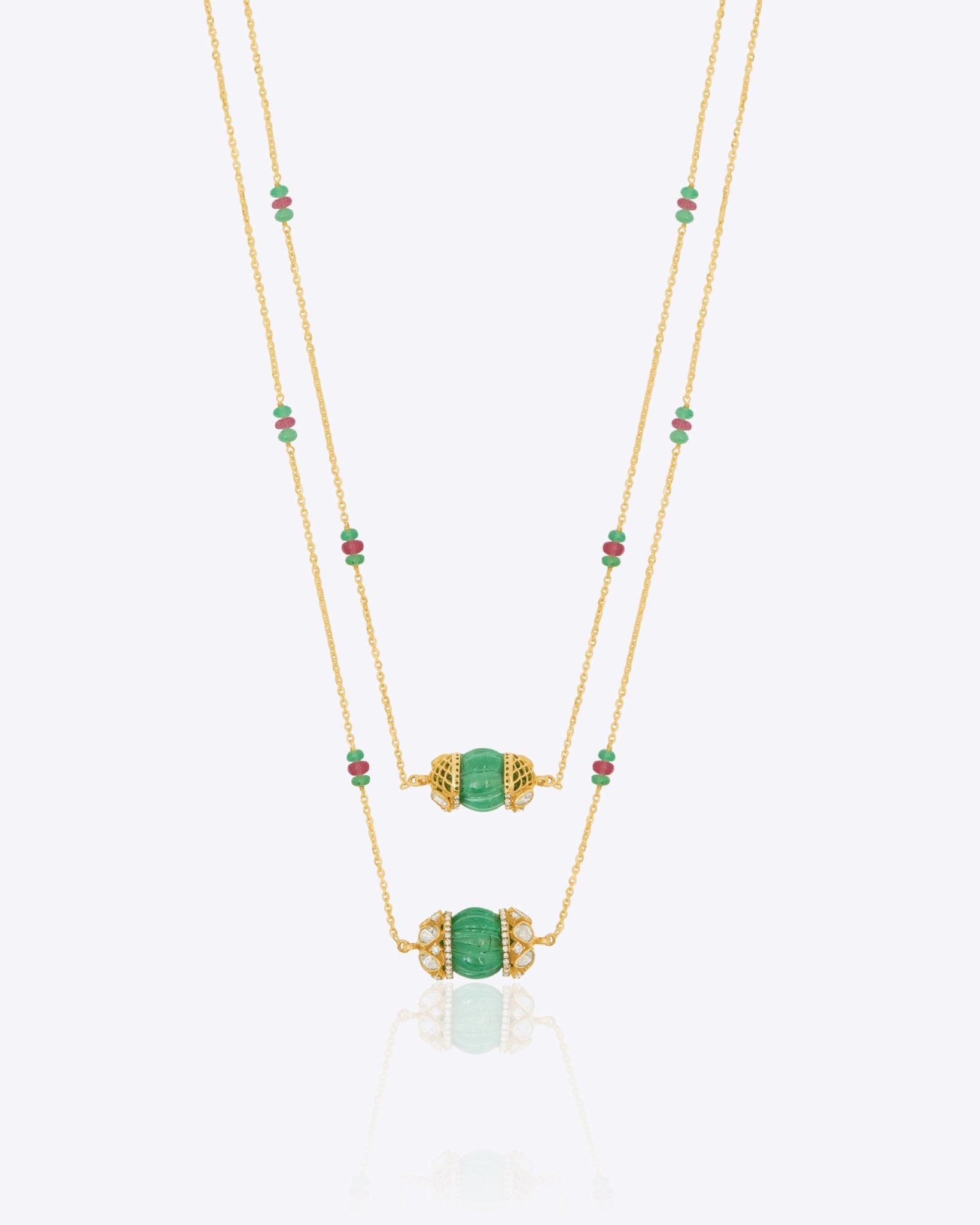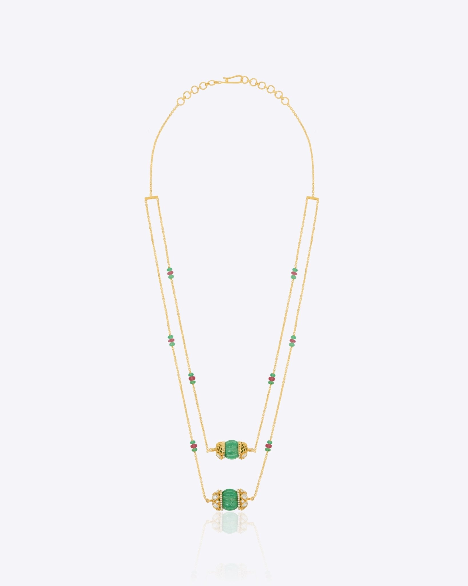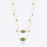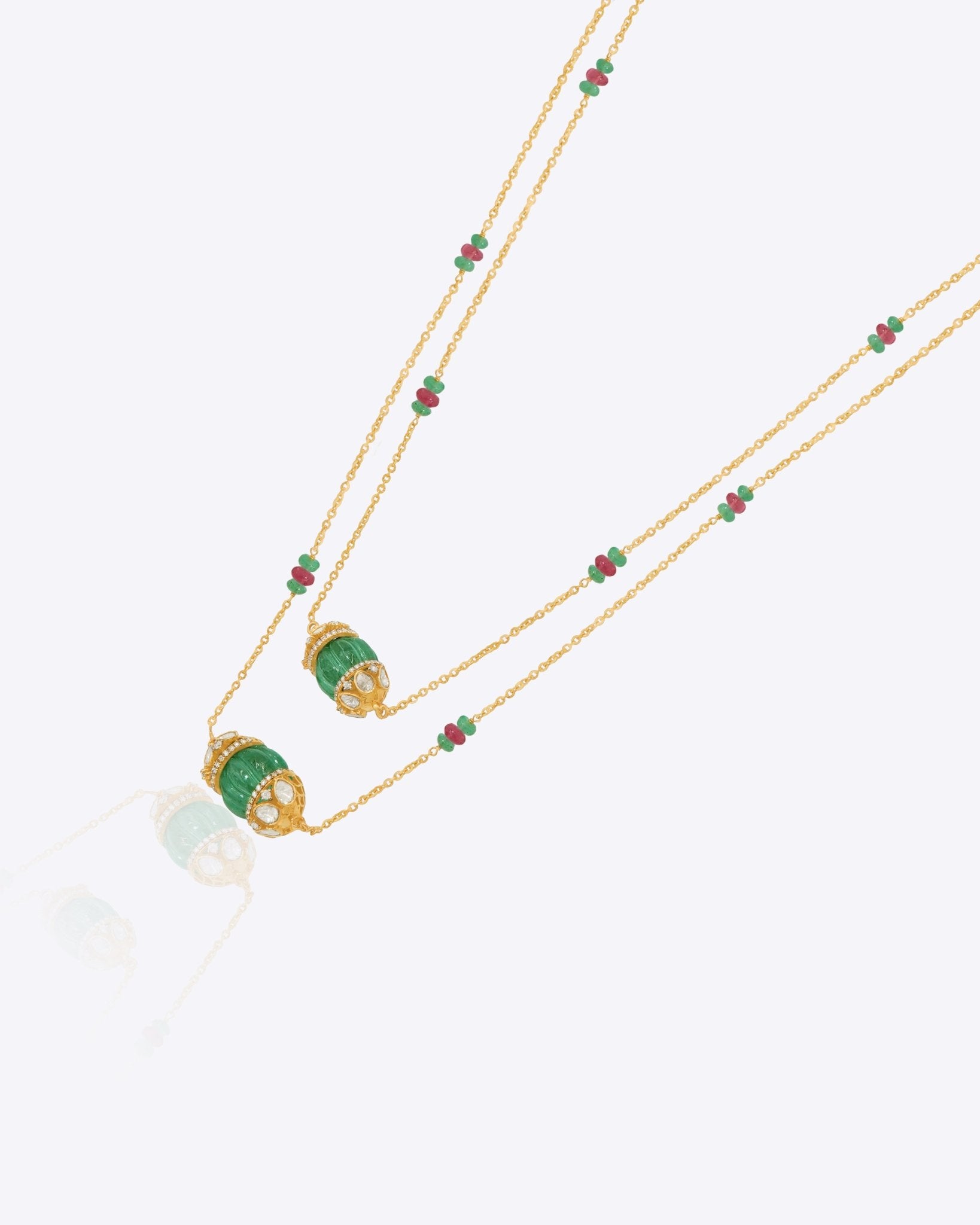 Handcrafted in 14K gold, this elegant necklace showcases a delicate design with emerald-green gemstones and ruby accents, set along a double-stranded chain. A timeless piece that combines rich color with refined craftsmanship.