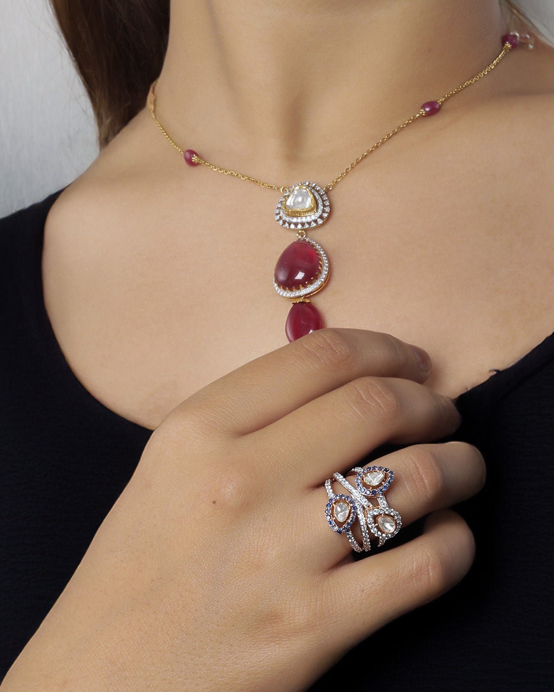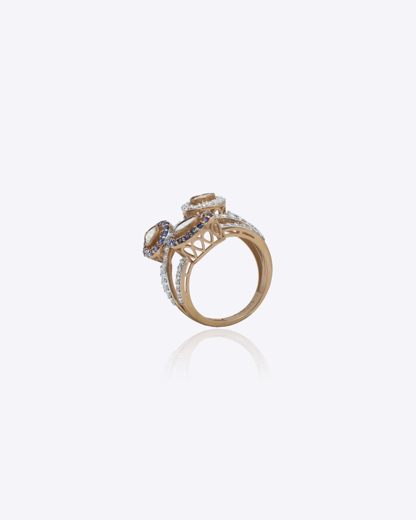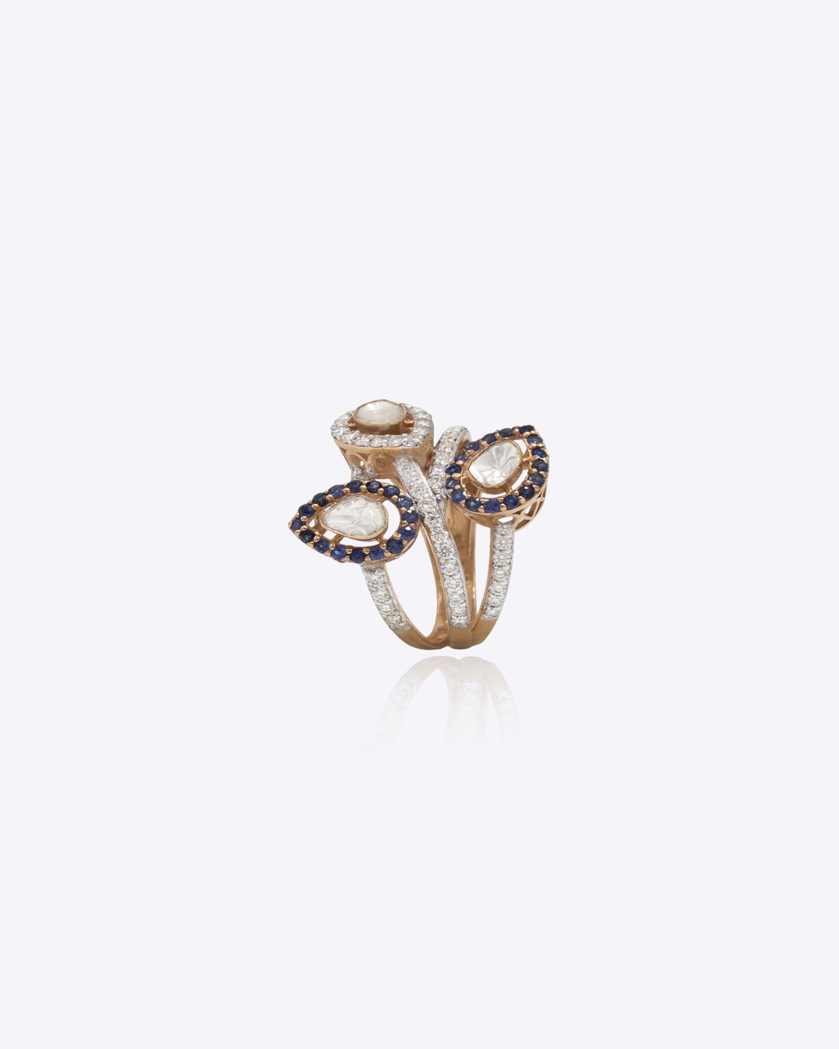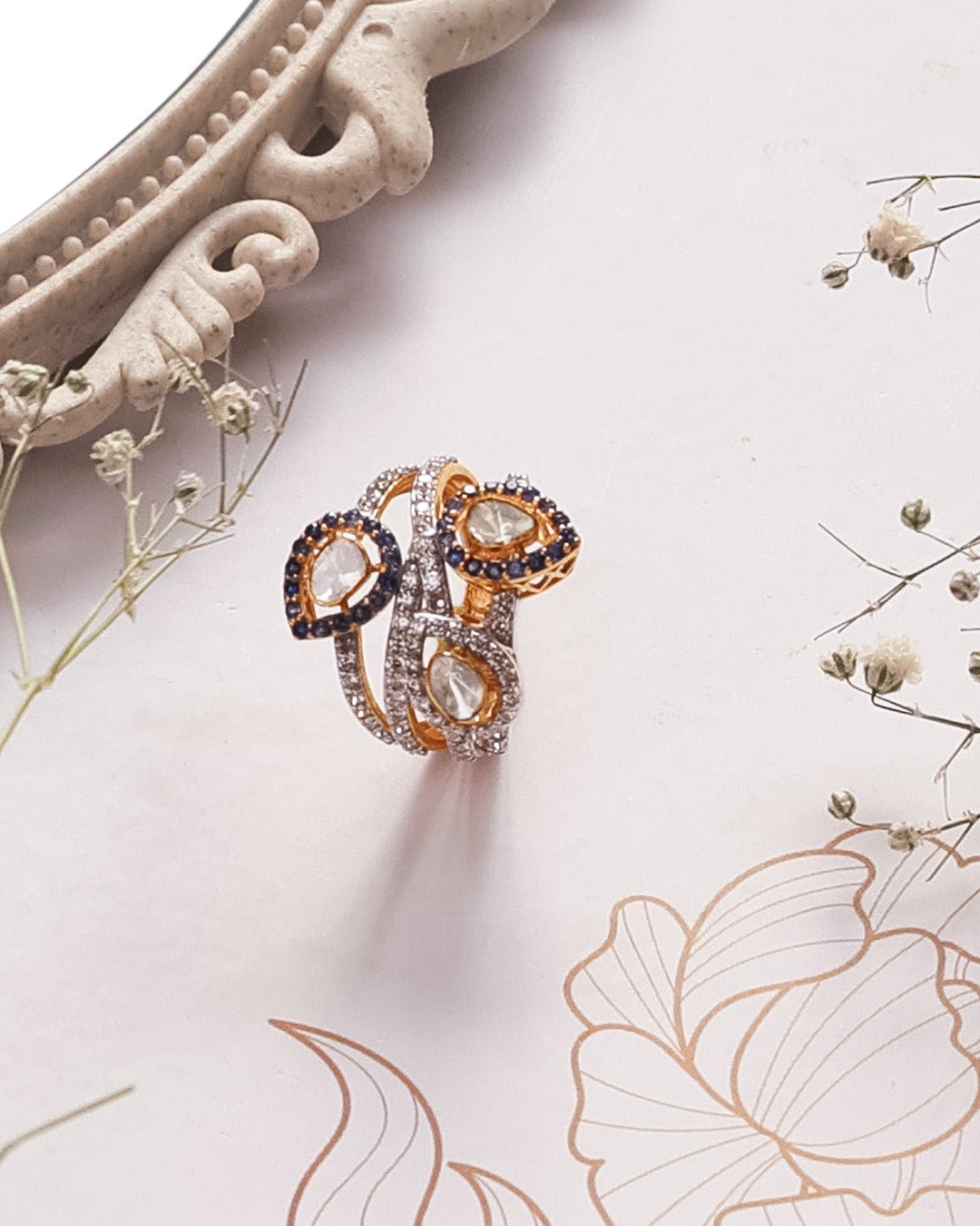 Crafted in 18K gold with sapphire and Polki diamonds, the Rayline Ring blends sleek lines with radiant sparkle — a refined piece for everyday wear and celebrations alike.