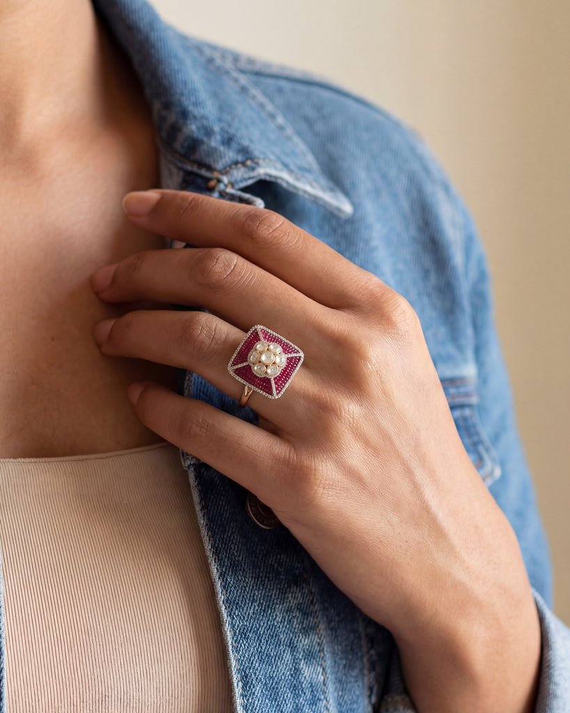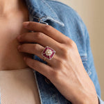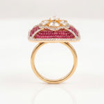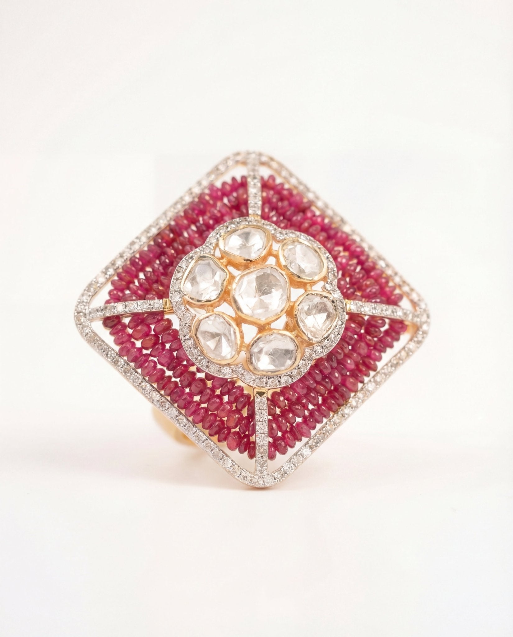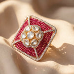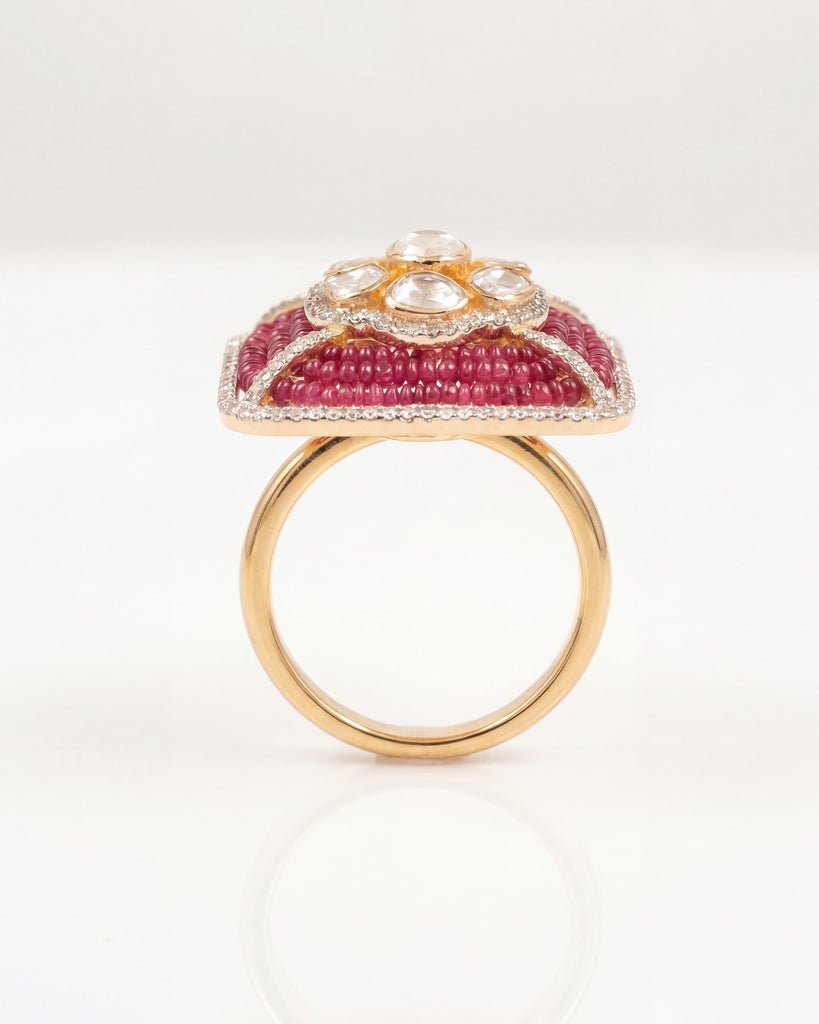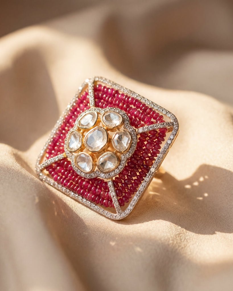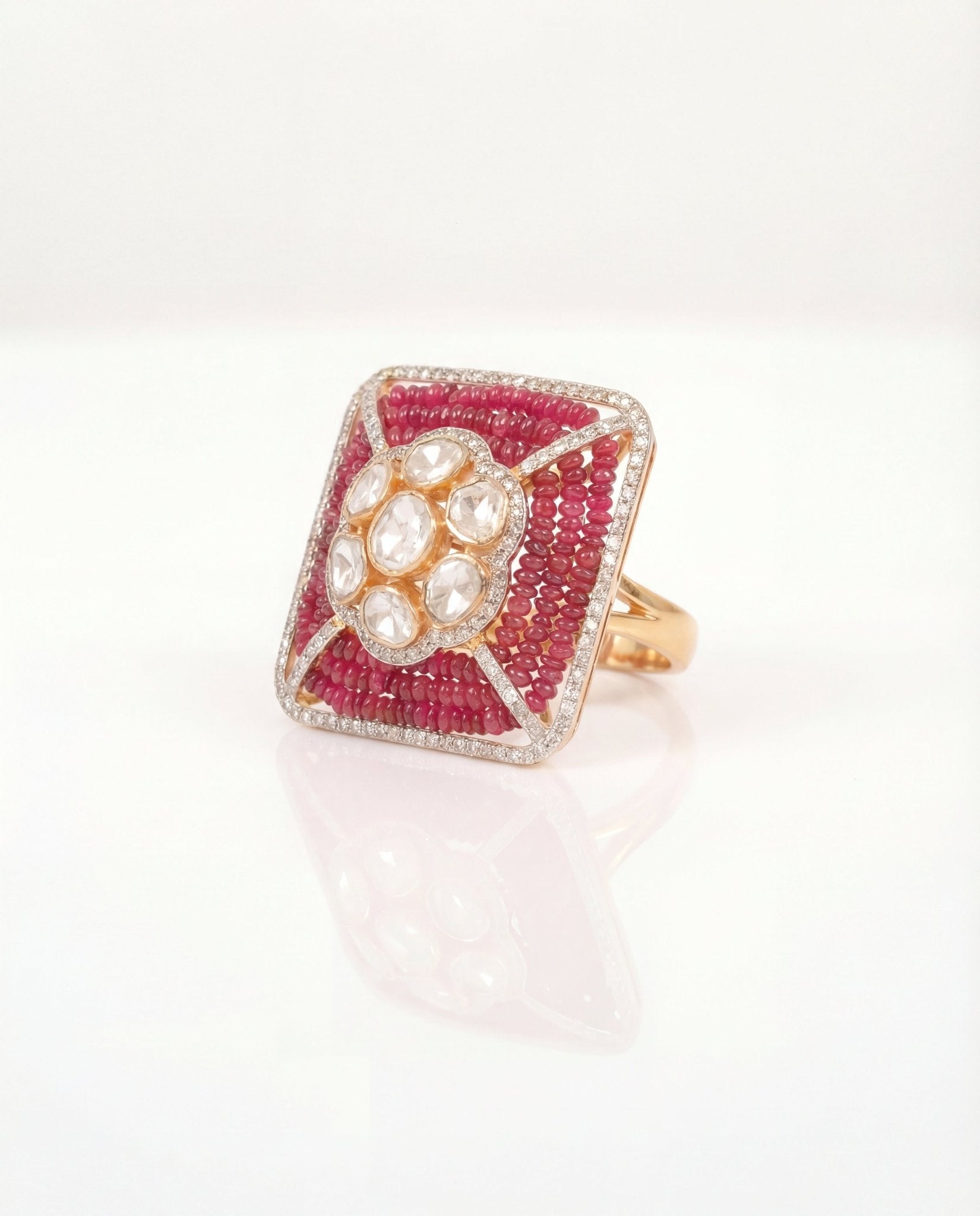 The Sangria Polki Ring in 14k gold features radiant rubies and polki diamonds framed in a rectangular design, encircled by a halo of shimmering diamonds. A bold yet timeless jewel of elegance.