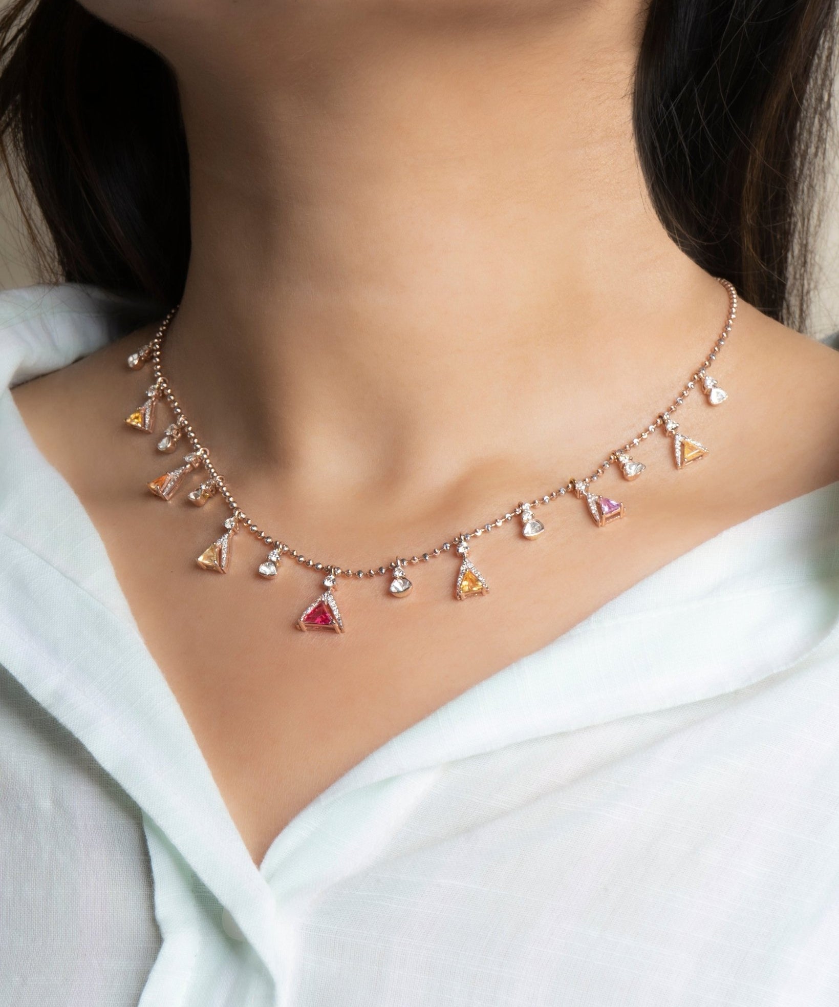 The Solar Plexus Chakra Necklace in 14k gold with Polki diamonds and tourmaline beads glows with radiant strength. A refined design celebrating personal power.