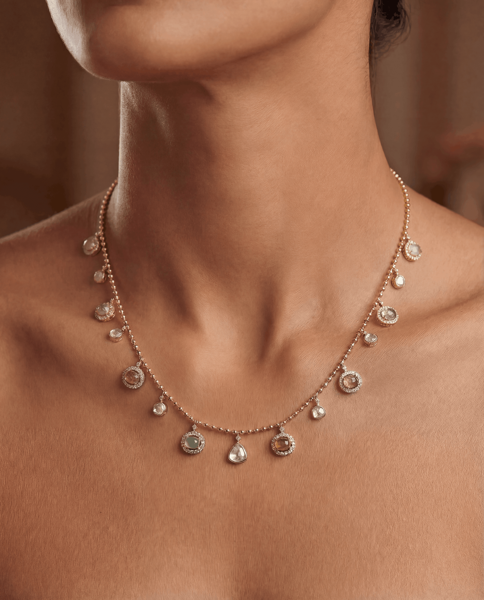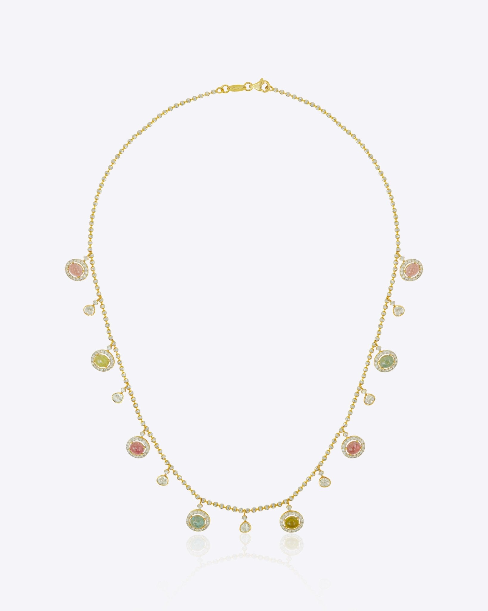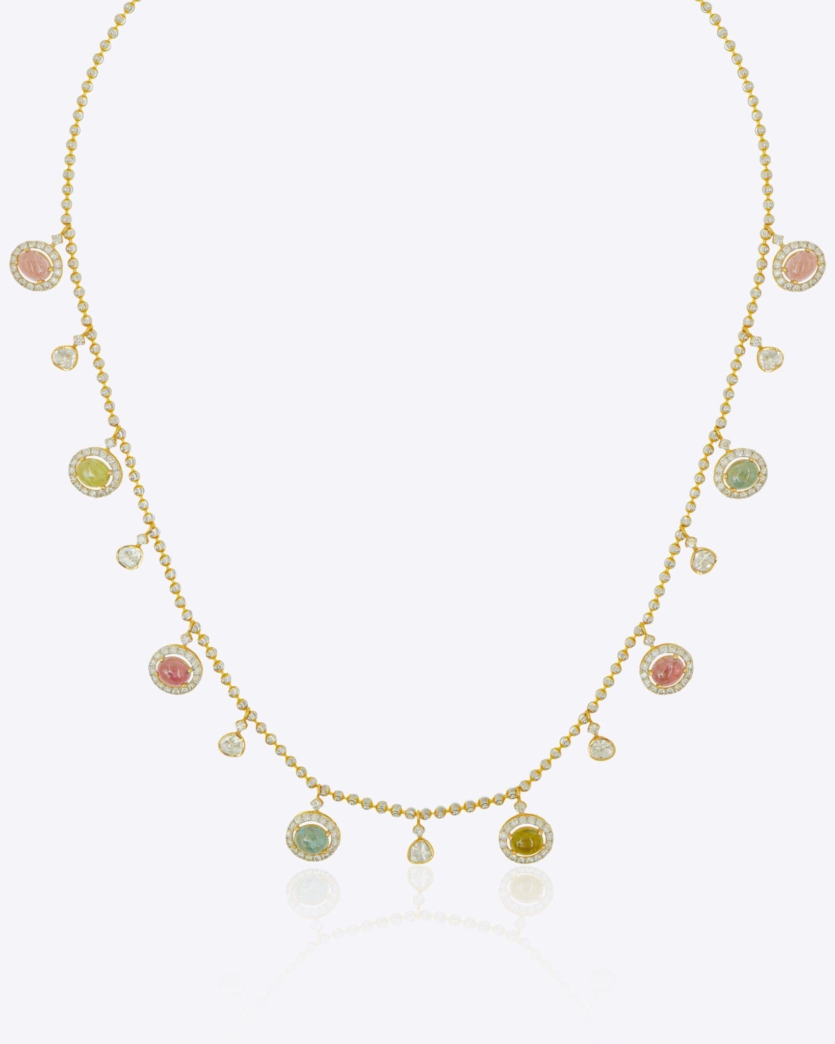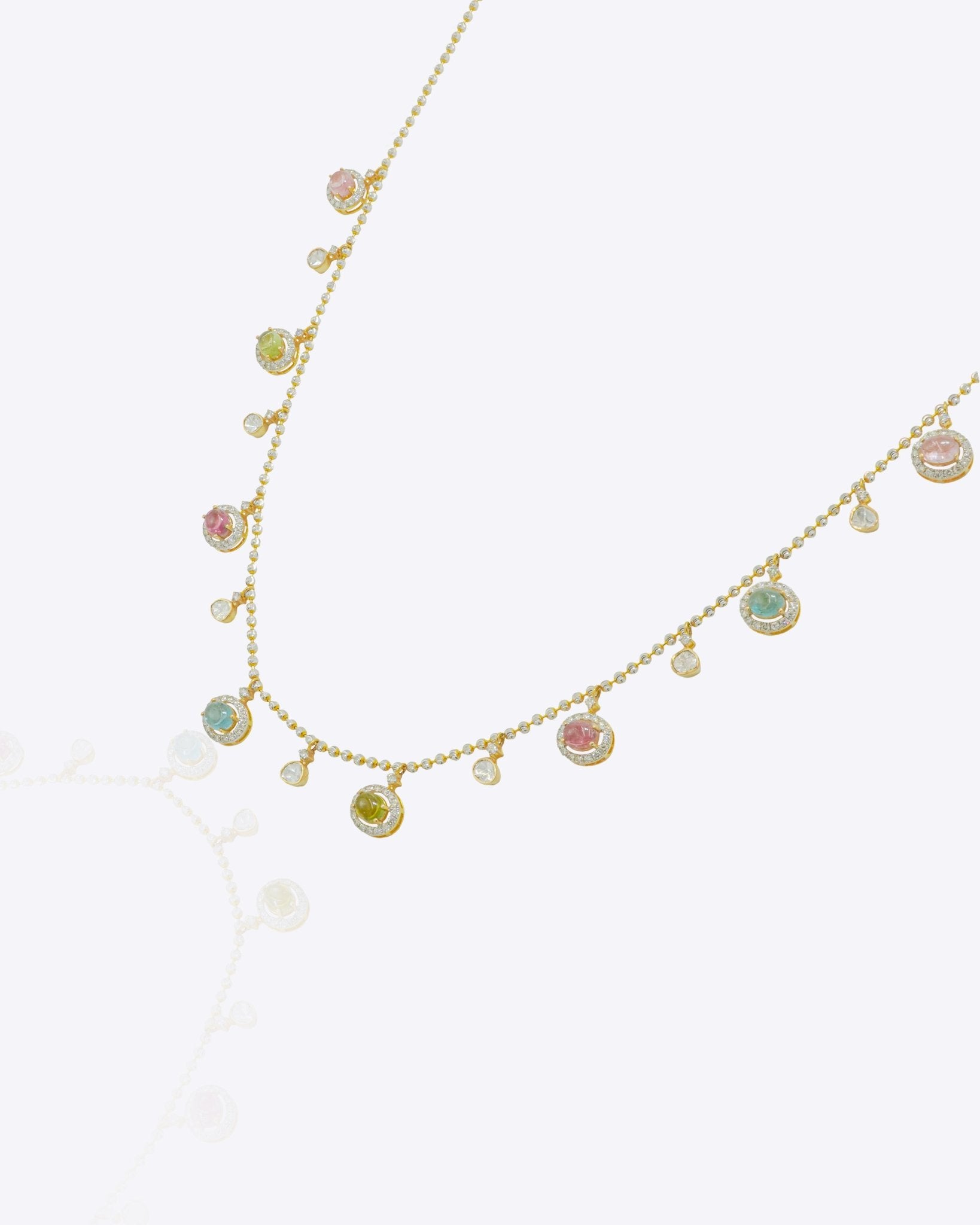 A rhythmic sweep of soft-toned tourmaline drops set in 18k gold, The Gemline Necklace captures movement in its most refined form. Fluid, balanced, and quietly luminous.