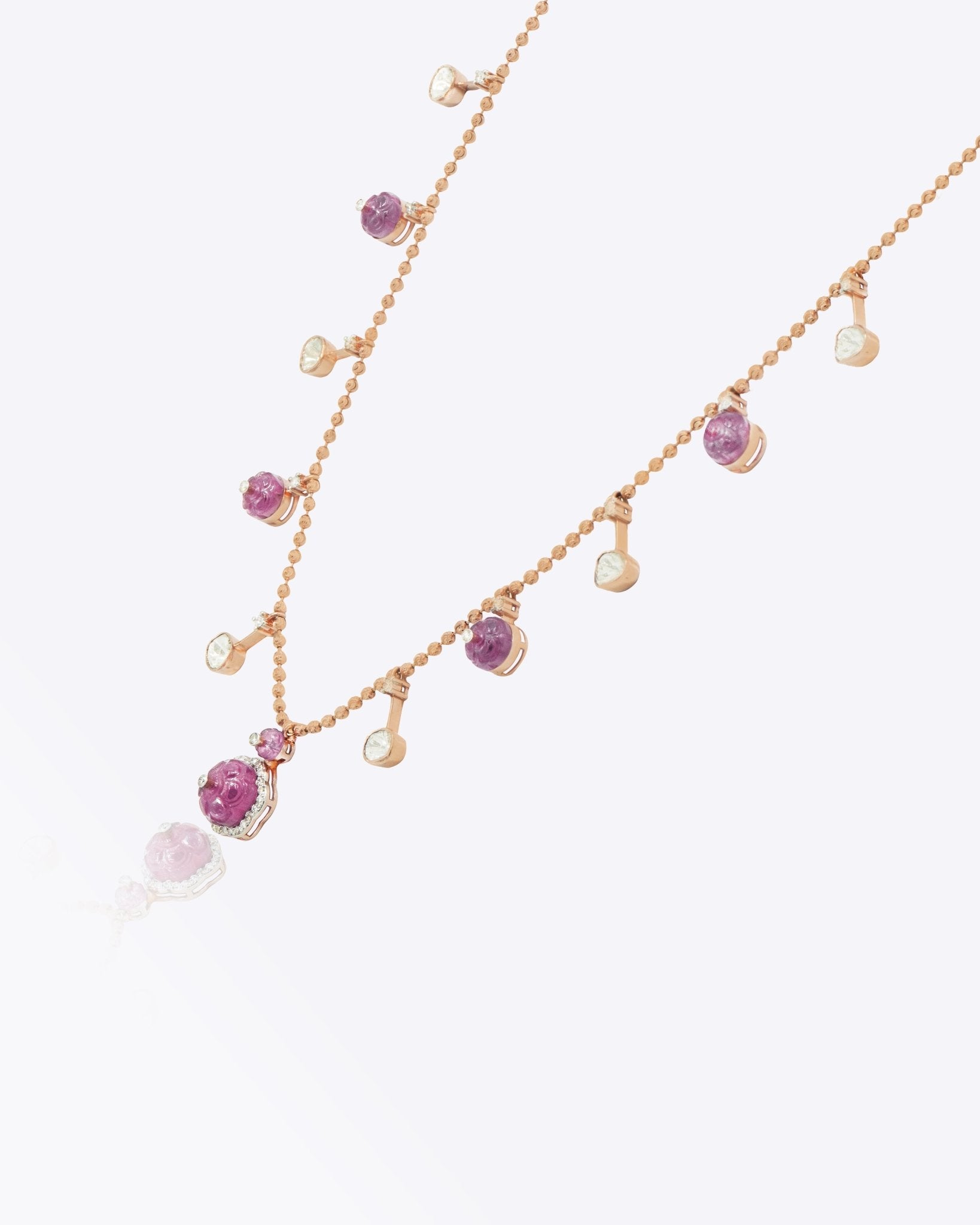 Handcrafted in 14K gold, this elegant necklace features brilliant ruby blooms accented with sparkling Polki drops, creating a graceful, flowing cascade. A captivating piece that blends traditional artistry with modern sophistication.