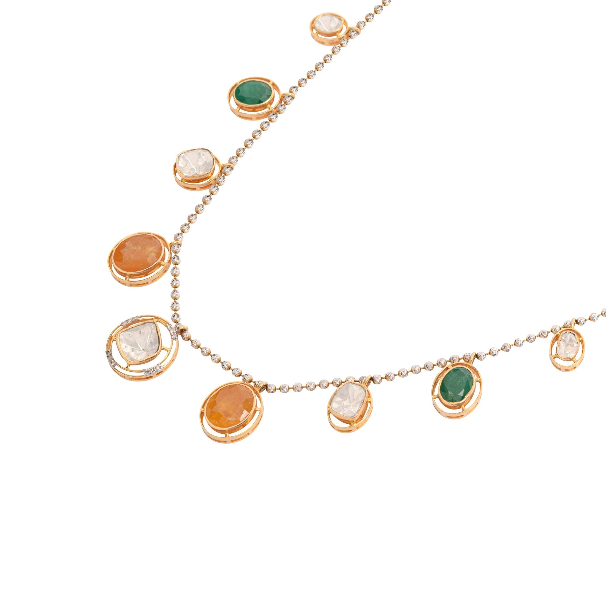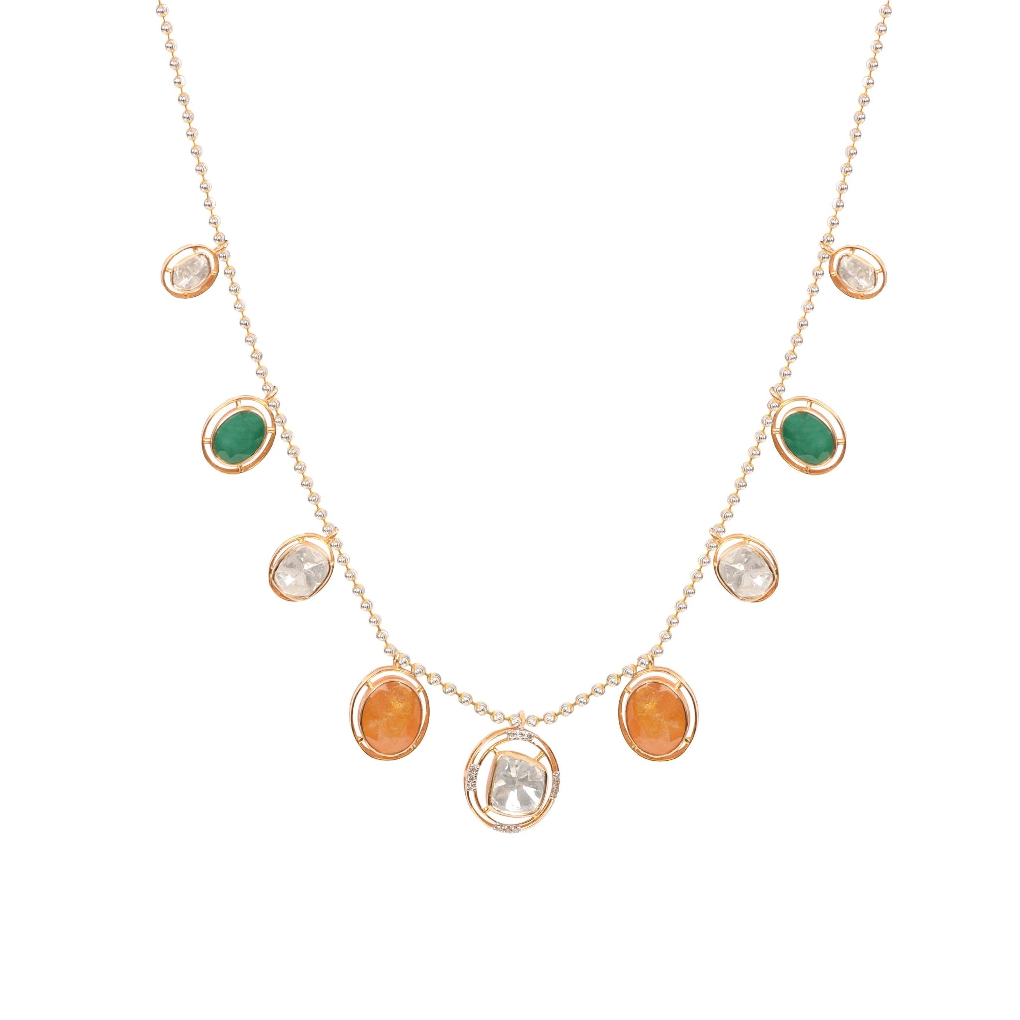 Designed in 18K gold, this necklace features ruby, emerald, and diamond polki set in intricate circular frames. Each gemstone is thoughtfully placed for a balanced, vibrant finish.