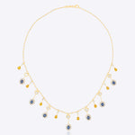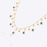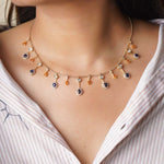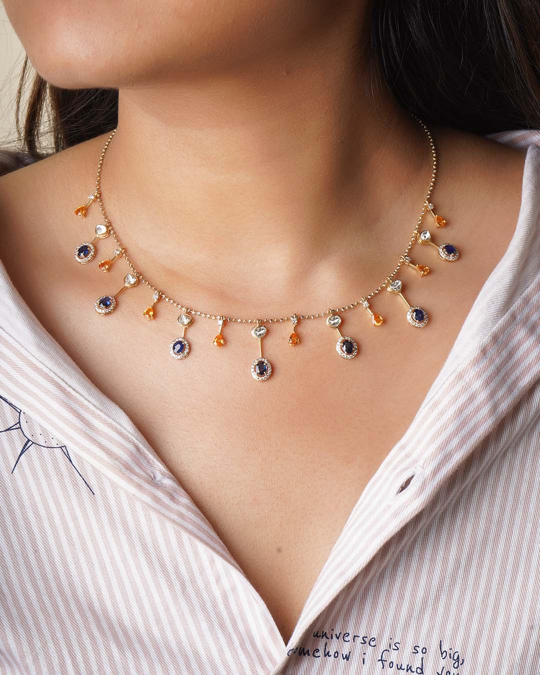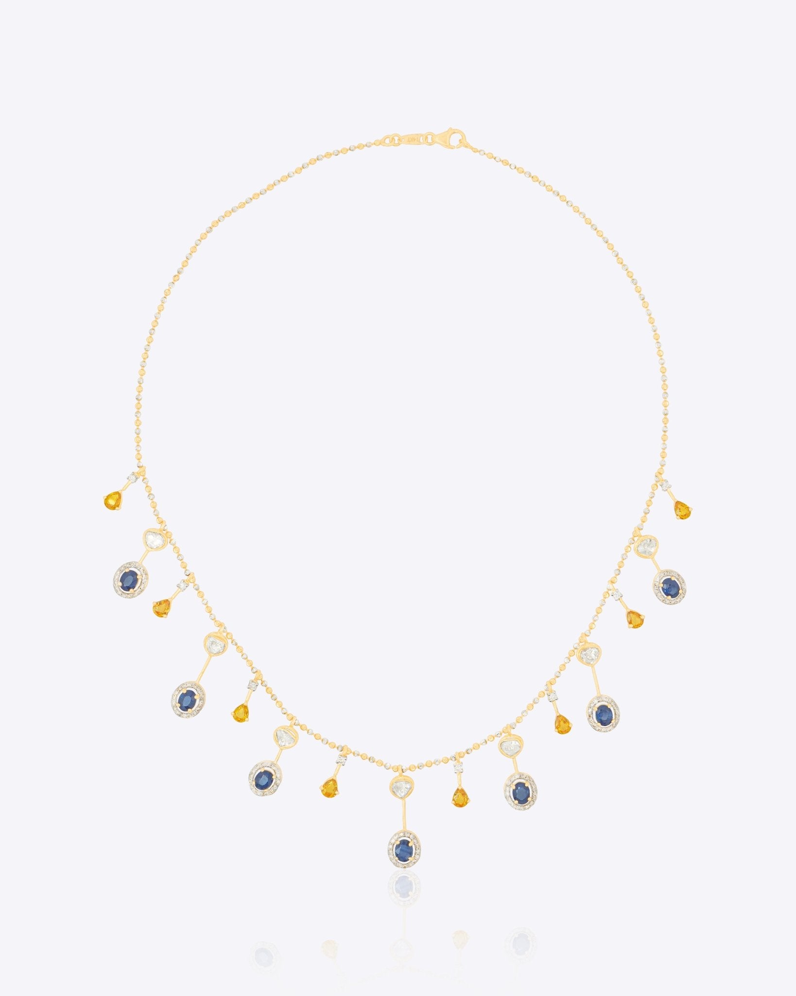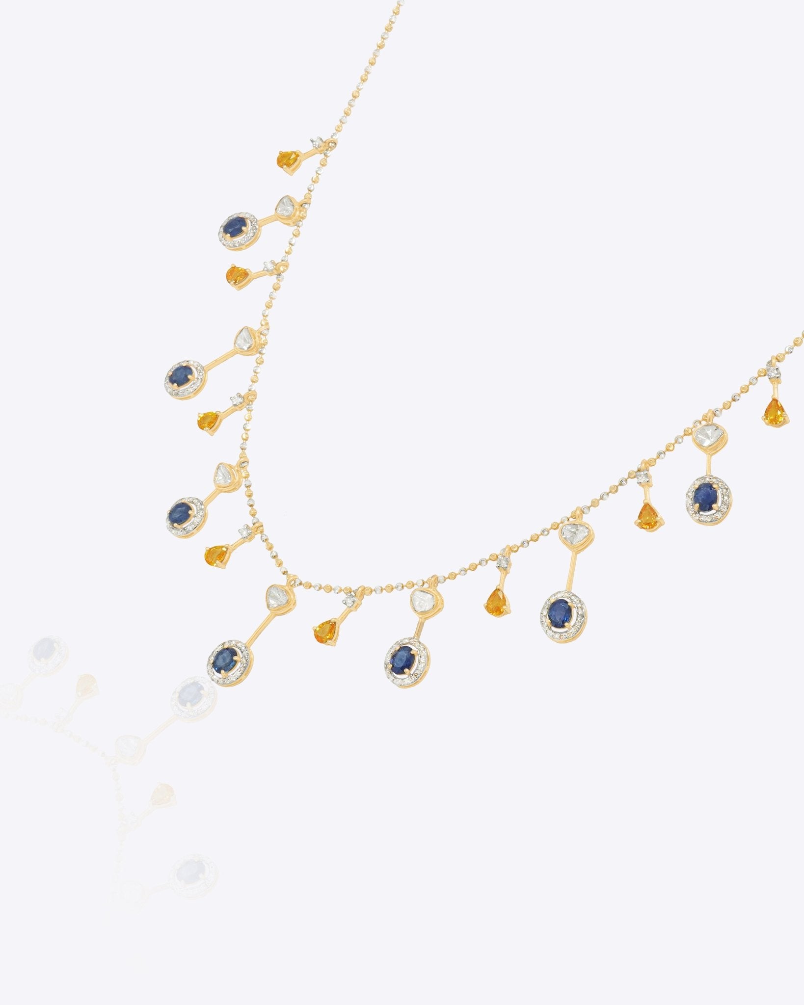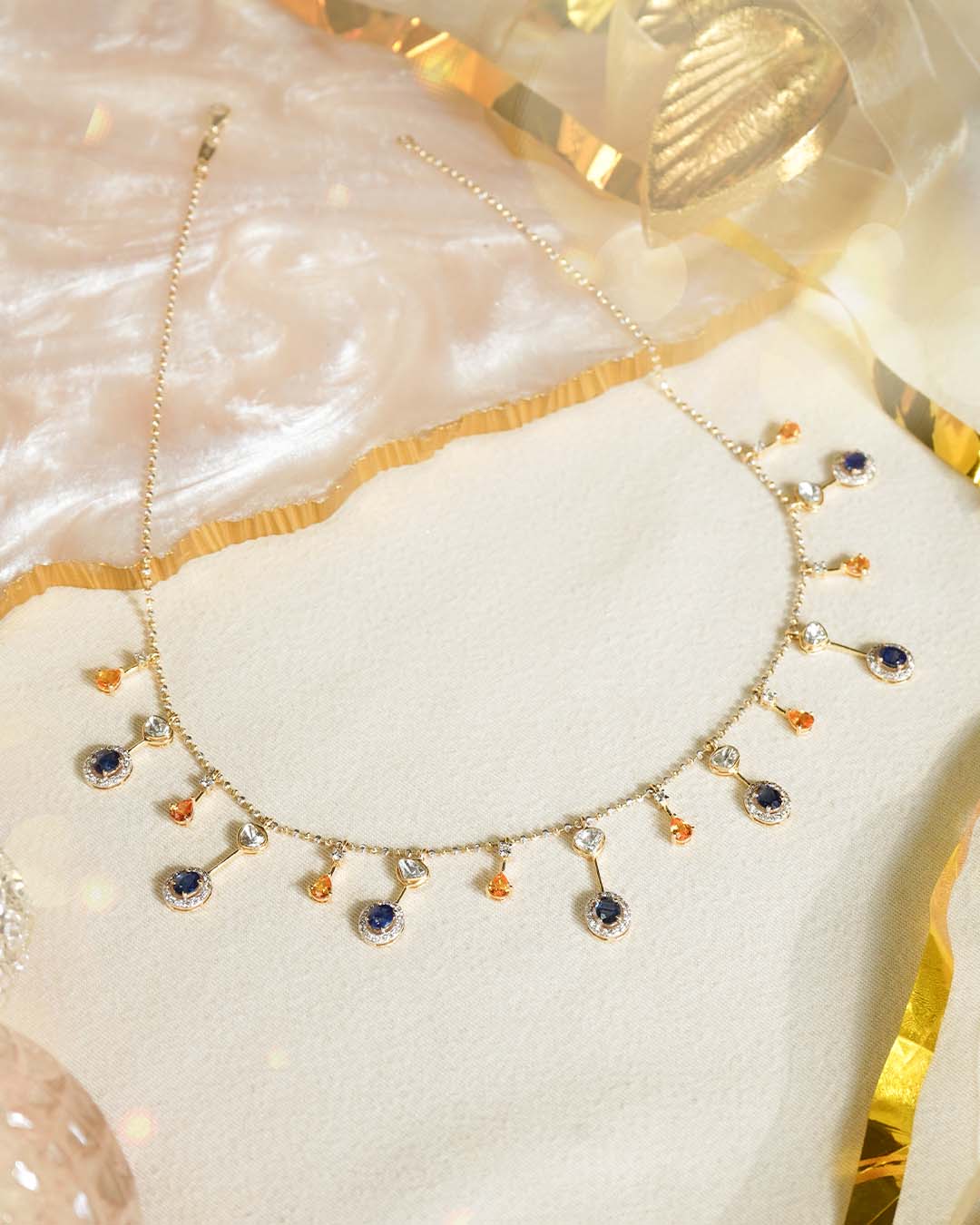 Handcrafted in 14K gold, this heritage necklace features a continuous cascade of blue sapphires, polkis, and warm-toned gemstones. A majestic statement piece that beautifully blends vibrant color with sophisticated artistry.