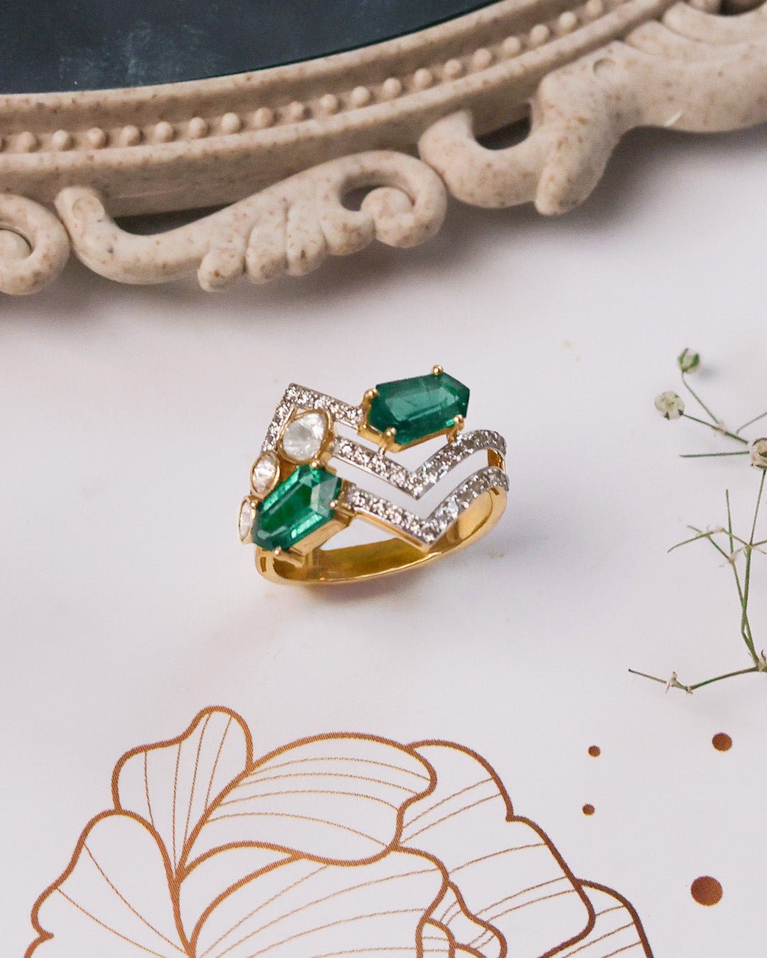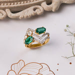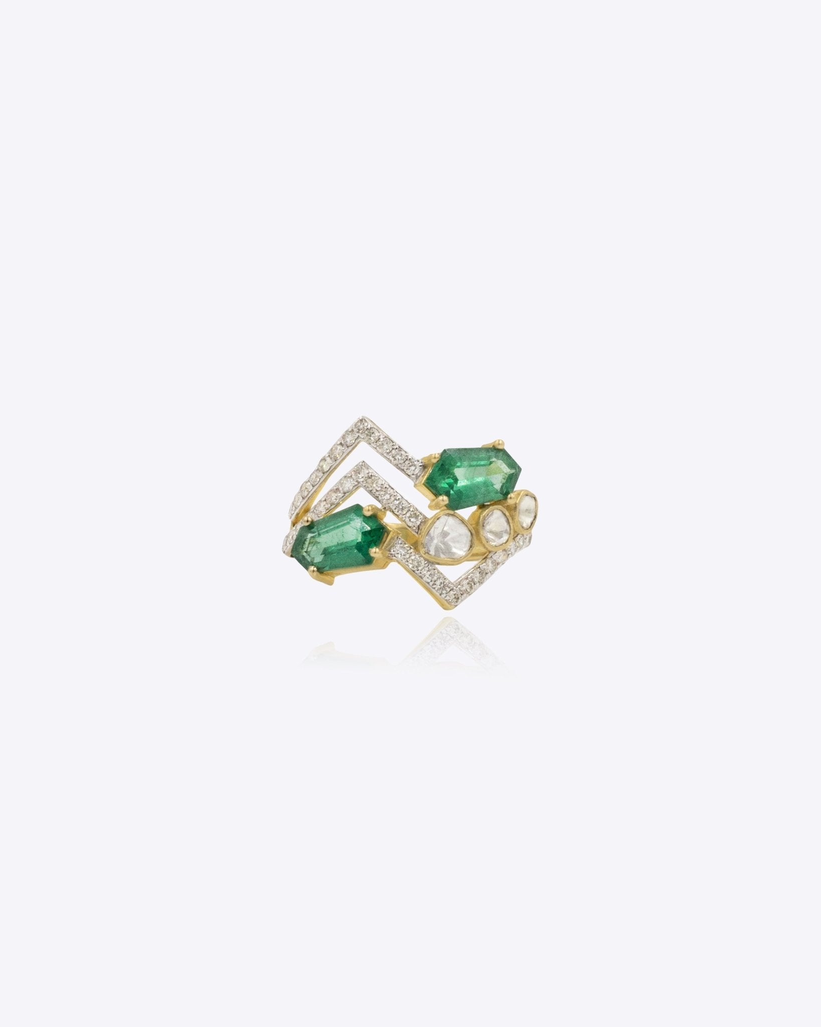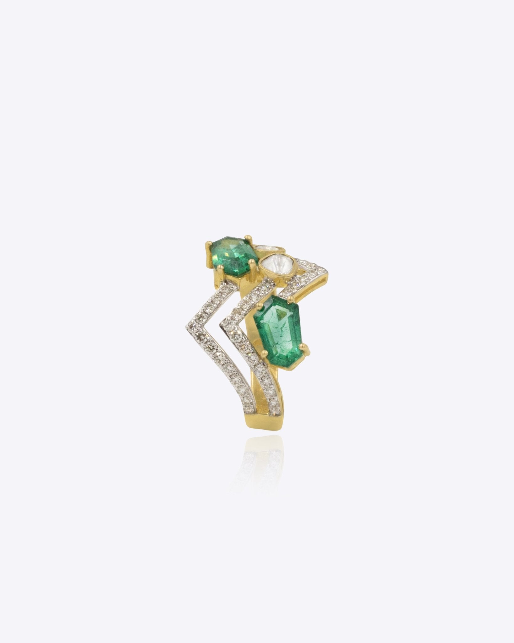 Crafted in 14K gold and adorned with sparkling diamonds and Polki, the Zyra Ring features a modern zig-zag design that adds a bold, contemporary edge to any look.